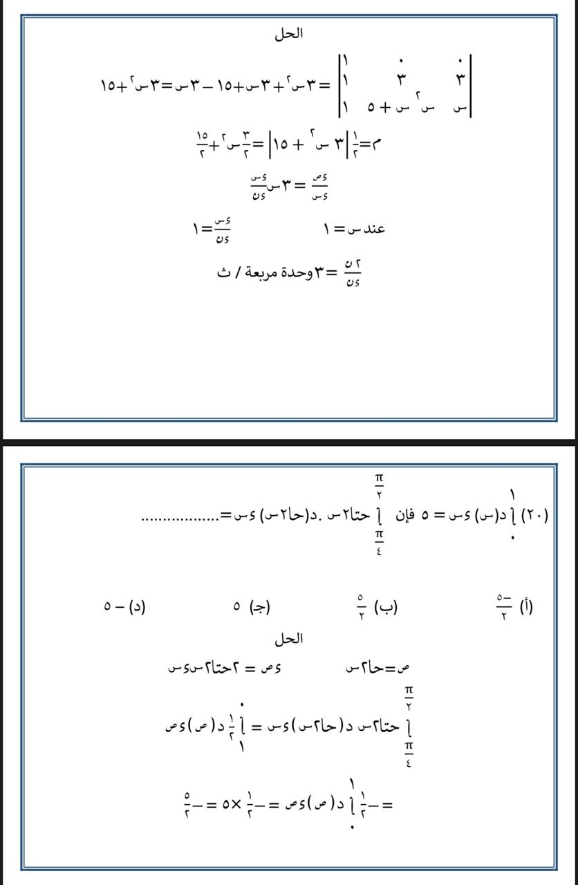 يستغل طلاب شعبة الرياضية هذه الفترة في حل العديد من امتحانات مادة التفاضل والتكامل، حتى يطمأنوا على تحصيل كافة أجزاء المنهج، فهذه الفترة هي الفرصة الأخيرة لطلاب الثانوية العامة في مراجعة المواد بشكل كامل قبل بدء الامتحانات خلال الأيام المقبلة، ونعرض لكم بعض الأسئلة المتوقعة في مادة التفاضل والتكامل، والتي جاءت كالآتي: