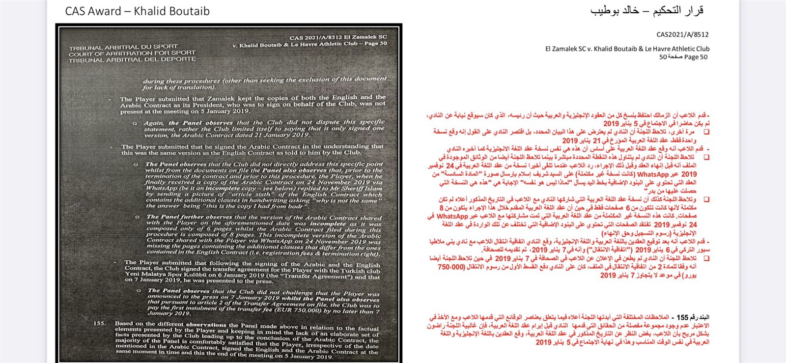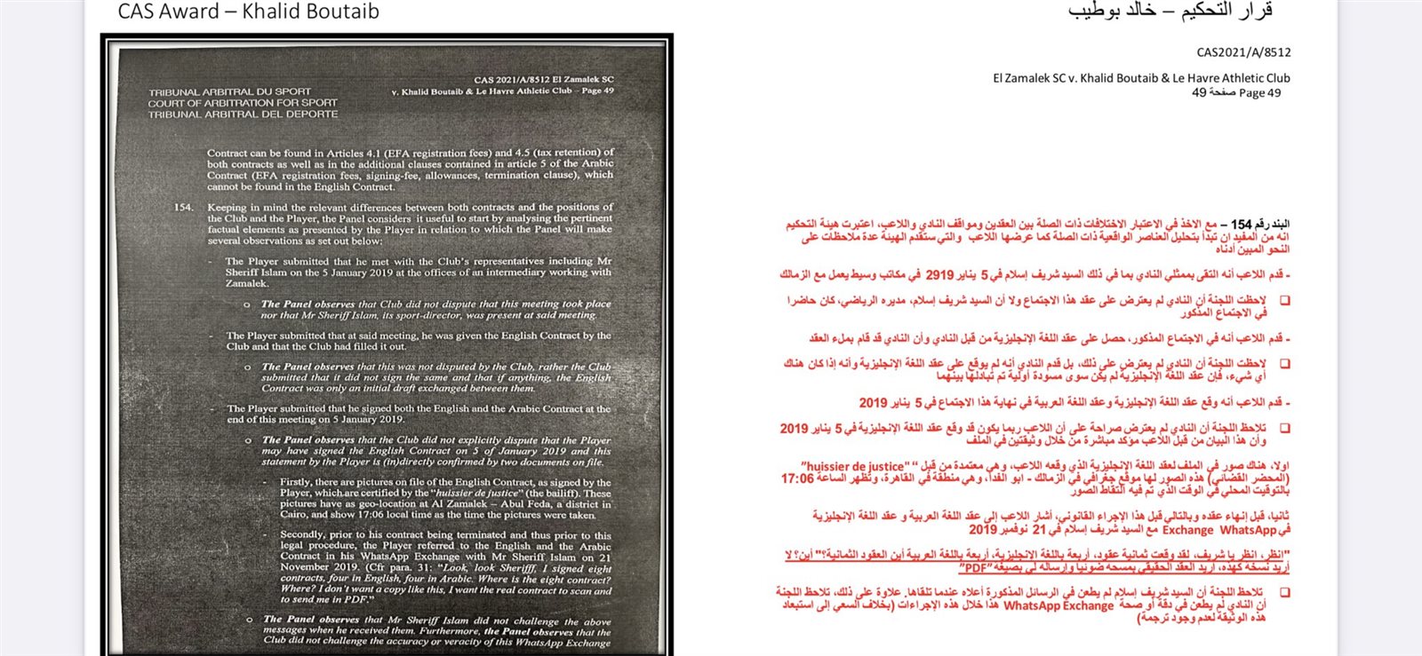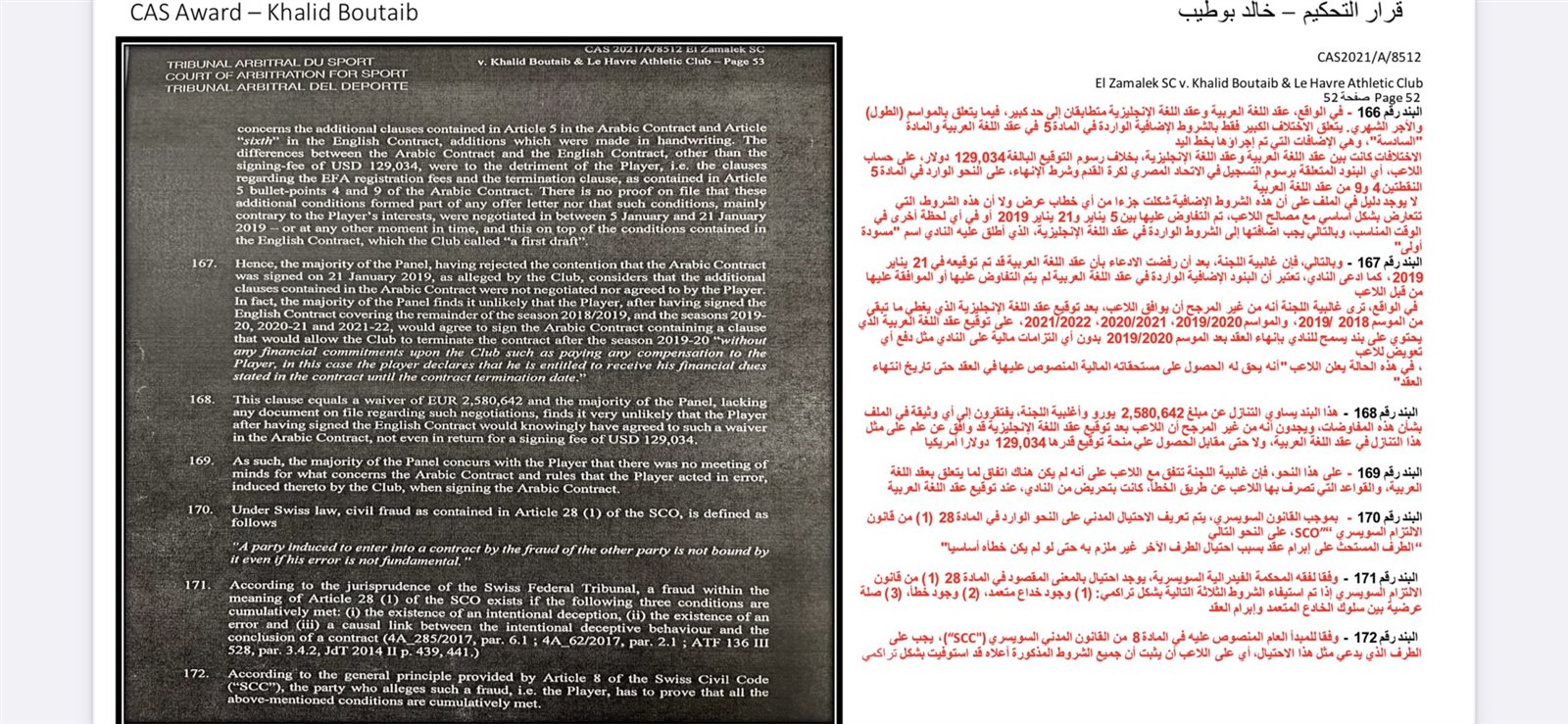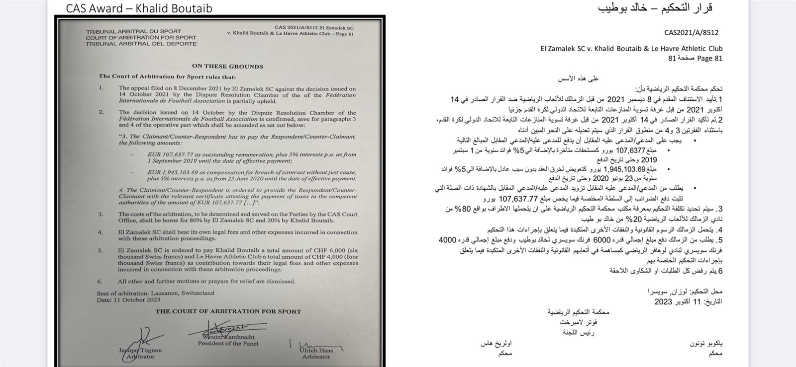 وأكد عمرو أدهم مجلس إدارة الزمالك عبر حسابه على موقع التواصل الاجتماعي إكس، أنه قرر نشر حيثيات الحكم الصادر ضد القلعة البيضاء في قضية خالد بوطيب قائلًا: أنشر اليوم بعض حيثيات حكم محكمة التحكيم الرياضي في قضية خالد بو طيب لتعريف الرأي العام ببعض تفاصيل القضية تاركا الحكم للرأي العام الزملكاوي لتحديد المسئول ومحاسبته معنويا وأخلاقيا وهي الحيثيات التي قد تكون محل اهتمام جهات رسمية أخرى ترغب في التعرف على الحقيقة.