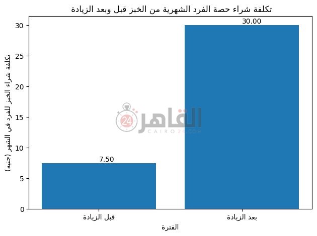 وبعد قرار زيادة سعر رغيف الخبز المدعم، أصبح سعر رغيف الخبز الواحد 20 قرشا، ونصيب الفرد اليومي منه يصل إلى 5 أرغفة، يصبح تكلفة شراء الفرد حصته الشهرية 30 جنيها، فيما تصل تكلفة شراء حصة أسرة 6 أفراد من الخبز المدعم شهريا تصل إلى 180 جنيها.