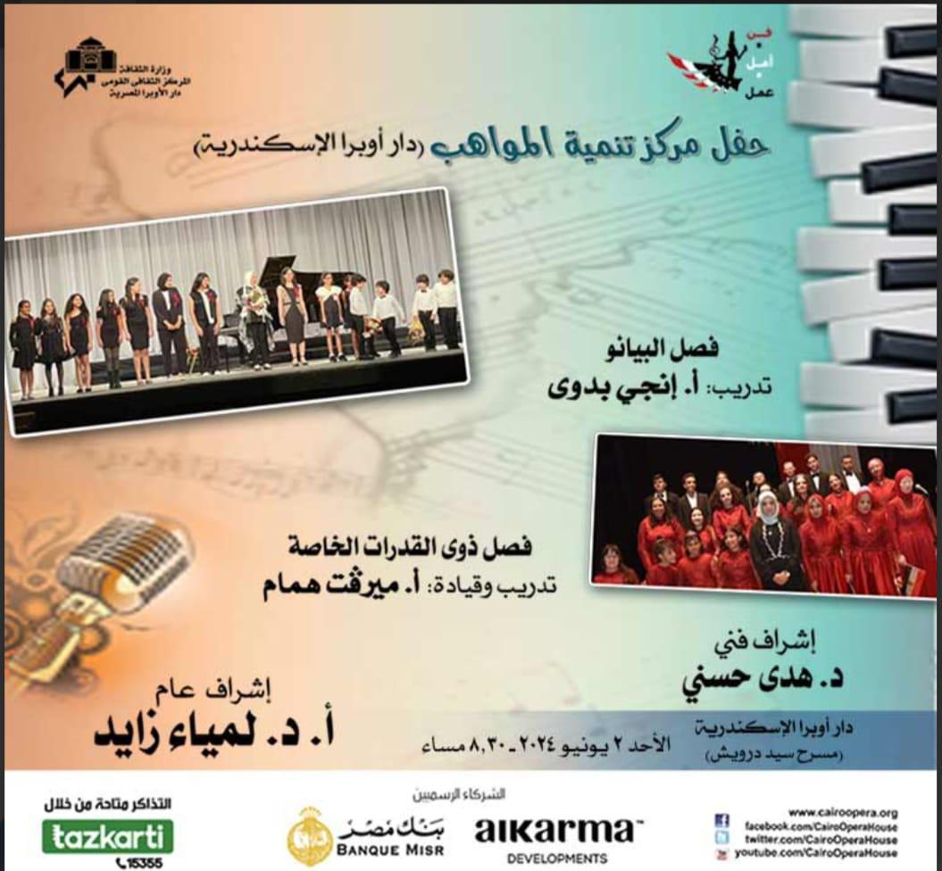 ضمن خطط وزارة الثقافة لدعم وتشجيع الواعدين، تقيم دار الأوبرا المصرية برئاسة الدكتورة لمياء زايد، حفلا للدارسين بمركز تنمية المواهب بأوبرا الإسكندرية، تحت إشراف الدكتورة هدى حسنى، وذلك فى الثامنة والنصف مساء الأحد 2 يونيو على مسرح سيد درويش أوبرا الإسكندرية.