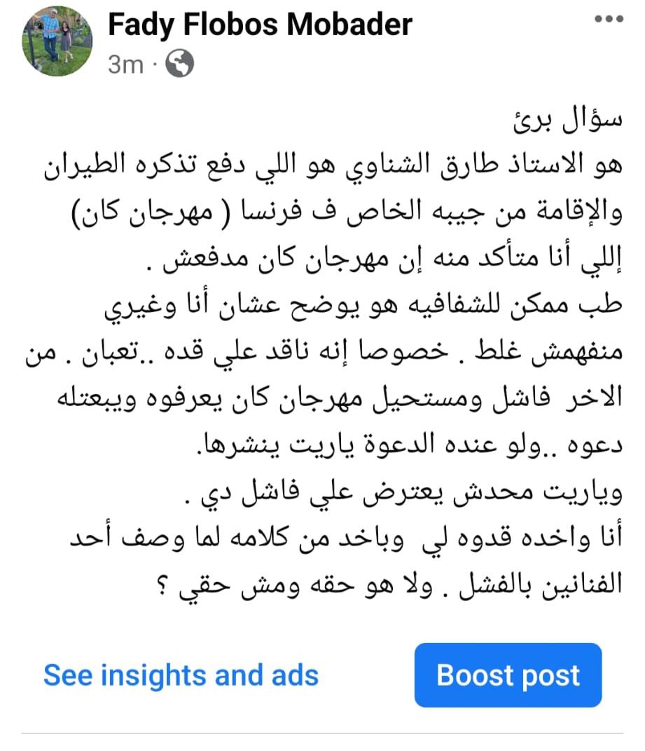 وقال أحد أفراد الجمهور: سؤال برئ.. هو الأستاذ طارق الشناوي هو اللي دفع تذكرة الطيران والإقامة من جيبه الخاص في فرنسا (مهرجان كان).. اللي أنا متأكد منه إن مهرجان كان مدفعش.