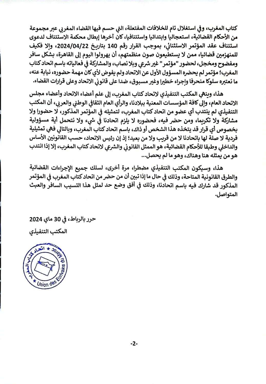 غير أنه ونحن نسعى لإيجاد حل للتسوية، انتهى إلى علمنا أن السيد الأمين العام قد قام بتوجيه دعوات إلى مجموعة من الأشخاص، من اتحادات الكتاب العربية، لتكريمهم بمناسبة المؤتمر العام، فطالبناه، من جهتنا، بأن يكشف لنا عن اسم المدعو من اتحاد كتاب المغرب الذي اقتُرح تكريمه، وعبر أكثر من رسالة مكتوبة وجهناها إليه عبر تطبيق واتساب؛ خاصة وأنه كان واجبا عليه استشارة رئيس اتحاد كتاب المغرب في الأمر، باعتبار اتحادنا عضوا في مجلس الاتحاد العام، وهذا الأخير هو الجهة المخول لها قانونيا، ووفق المادة العاشرة من النظام الأساس للاتحاد العام للأدباء والكتاب العرب، اقتراح الأسماء التي سيتم تكريمها بمناسبة عقد المؤتمر العام، لكن دون جدوى، لنفاجأ اليوم 29 ماي 2024، بأن ثمة شخصين قد تمت دعوتهما، في استهتار تام بالدعوة التي وجهت سابقا لرئيس الاتحاد، هما: نائب الرئيس إدريس الملياني ممثلا لاتحاد كتاب المغرب، ورئيس سابق لاتحاد كتاب المغرب، هو حسن نجمي، وذلك ضدا على النظام الأساس للاتحاد العام وقوانين اتحاد كتاب المغرب، وفي استغلال تام للخلافات المفتعلة، التي حسم فيها القضاء المغربي عبر مجموعة من الأحكام القضائية، استعجاليا وابتدائيا واستئنافيا، كان آخرها إبطال محكمة الاستئناف لدعوى استئناف عقد المؤتمر الاستثنائي، بموجب القرار رقم 140 بتاريخ 22/04/2024، وإلا فكيف للمنهزمين قضائيا، ممن لا يستطيعون صون منظمتهم، أن يهرولوا اليوم إلى القاهرة، بشكل سافر ومفضوح ومخجل، لحضور مؤتمر غير شرعي وبلا نصاب، والمشاركة في فعالياته باسم اتحاد كتاب المغرب؛ مؤتمر لم يحضره المسؤول الأول عن الاتحاد ولم يفوض لأي كان مهمة حضوره، نيابة عنه، ما نعتبره سلوكا منحرفا وإجراء خطيرا وغير مسبوق، ضدا على قانوني الاتحاد وعلى قرارات القضاء.