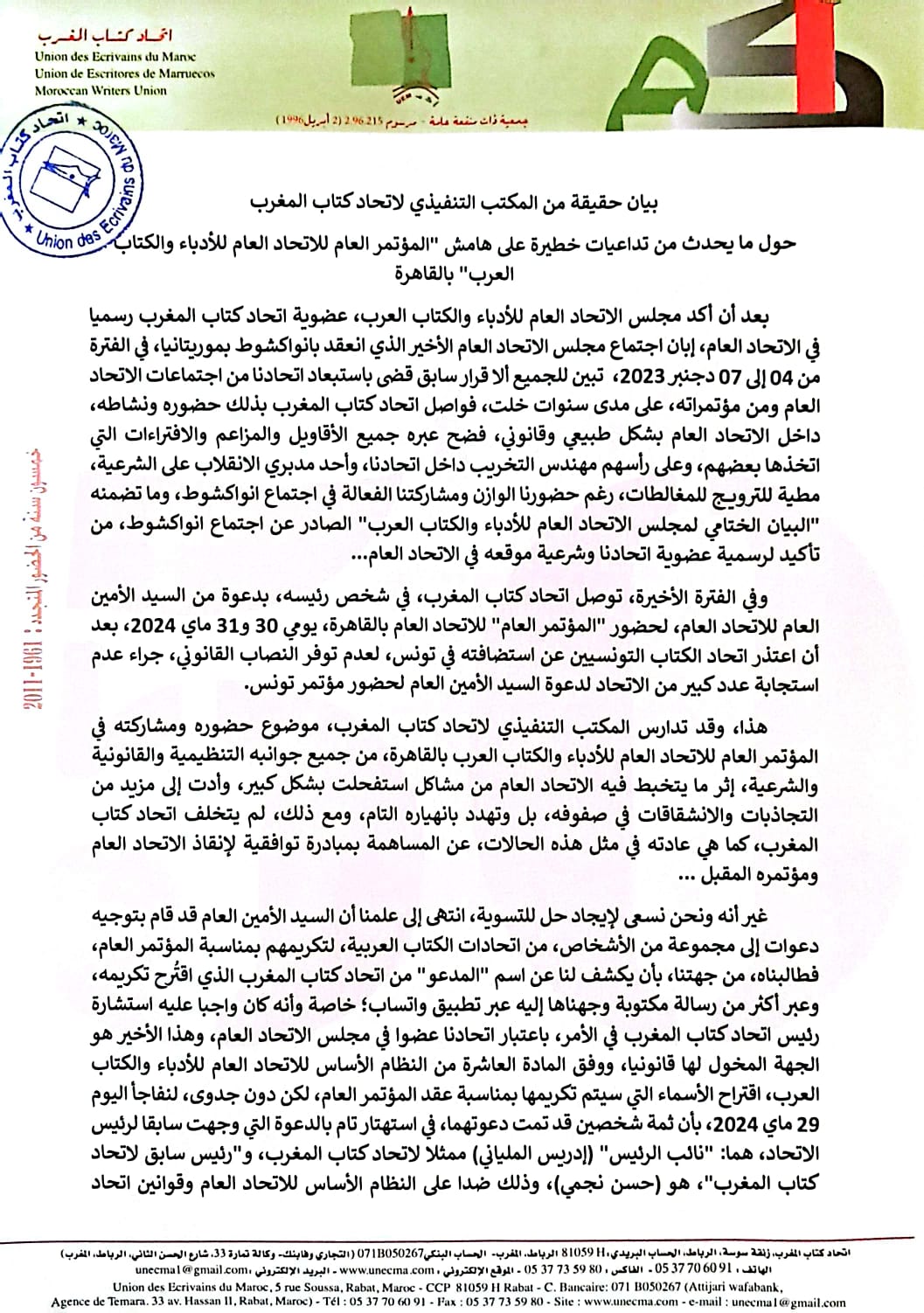 وأصدر المكتب التنفيذي لاتحاد كتاب المغرب بيانا تحت عنوان حول ما يحدث من تداعيات خطيرة على هامش المؤتمر العام للاتحاد العام للأدباء والكتاب العرب بالقاهرة، جاء فيه: