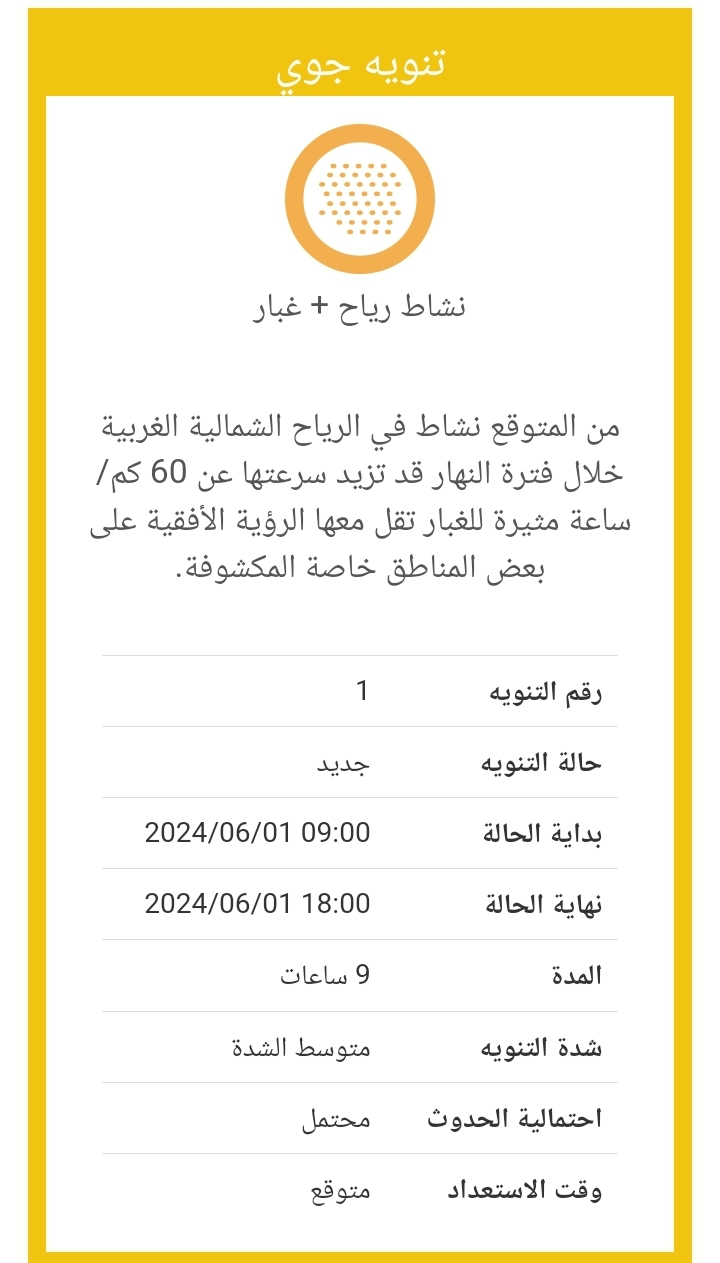 أطلقت إدارة الأرصاد الجوية تنويه جوي حول درجة الحرارة في الكويت اليوم التي تصل إلى 50 درجة، إضافة لاشتداد حركة الرياح المثيرة للغبار نهارًا، ليسود طقس شديد الحرارة، والرياح شمالية غربية معتدلة إلى نشطة السرعة 20 - 60 كم/ساعة مثيرة للغبار.
