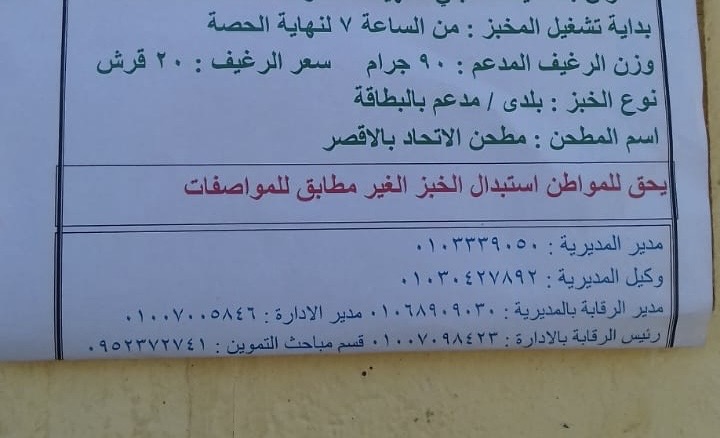 أشار إلى أنه منذ الصباح الباكر تم التأكد من تعليق الأفران لوحات بتعريف المواطنين بسعر رغيف الخبز ووزنه، وأنه يحق للمواطن تغيير الخبز الذي يراه غير مطابق وتقديم شكوى في حالة رفض أي مخبز ذلك.