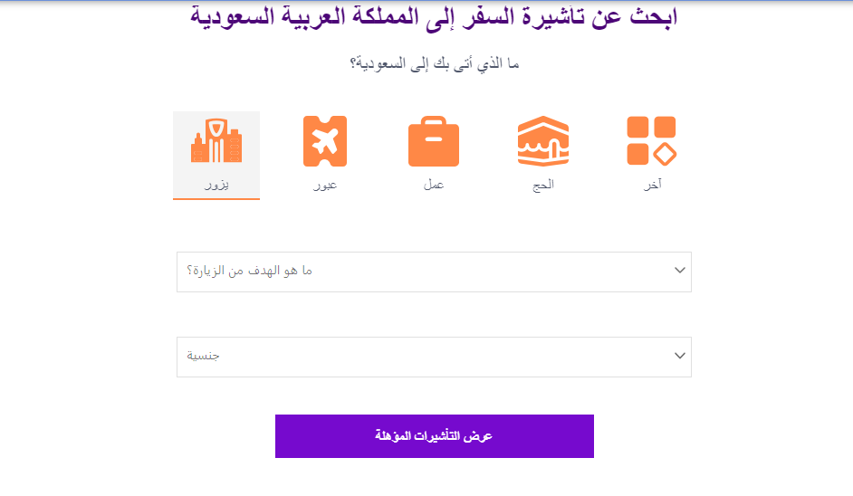 - وفي حالة تأشيرة الزيارة يتم تحديد سبب الزيارة من القائمة المنبثقة إما سياحة أو عائلة، أو عمرة، كما يتم تحديد جنسية الزائر.