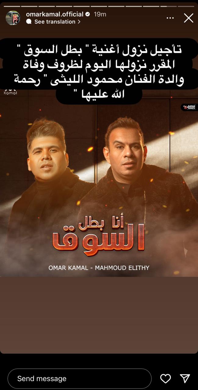 ونشر عمر كمال بوستر أغنية بطل السوق عبر ستوري على حسابه الرسمي بموقع إنستجرام، وعلق: تأجيل نزول أغنية بطل السوق، الذي كان من المقرر نزولها اليوم، لظروف وفاة والدة الفنان محمود الليثي، رحمة الله عليها.