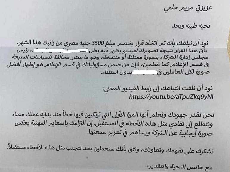 عزيزتي مريم حلمي، تحية طيبة وبعد، نود أن نبلغك بأنه تم اتخاذ قرار بخصم مبلغ 3500 جنيه مصري من راتبك هذا الشهر. يأتي هذا القرار نتيجة تصويرك لفيديو يظهر فيه بطن السيد عبد الرحمن الجمال، رئيس مجلس إدارة الشركة، بصورة ممتلئة أو منتفخة، وهو ما يعتبر مخالفة للسياسات المتبعة في قسم الإعلام.