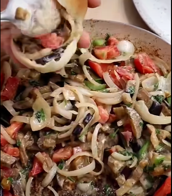 - أضيفي الثوم المهروس وبعد أن يذبل الباذنجان أضيفي البصل والفلفل والطماطم وقلبي.