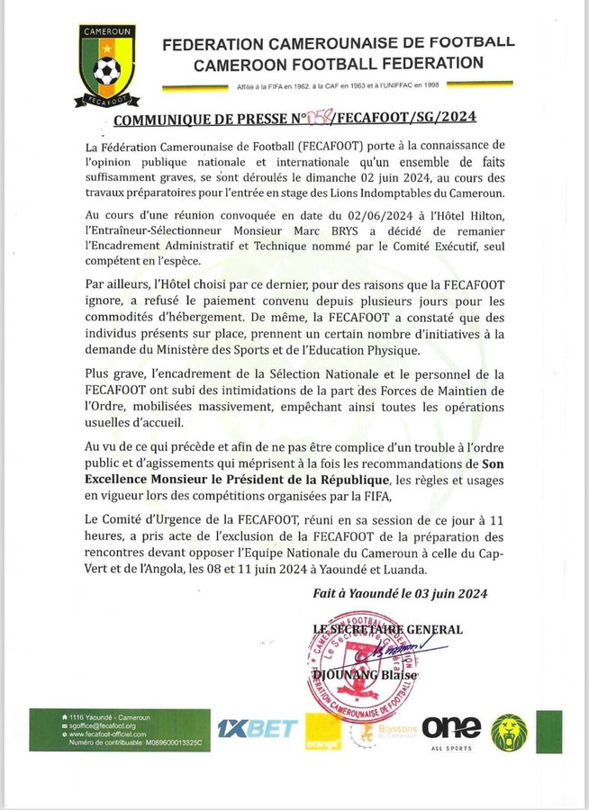 وجاء نص بيان الاتحاد الكاميروني لكرة القدم: يلفت الاتحاد الكاميروني لكرة القدم (FECAFOOT) انتباه الرأي العام الوطني والدولي إلى أن مجموعة من الأحداث الجادة بما فيه الكفاية حدثت يوم الأحد 2 يونيو 2024، خلال الأعمال التحضيرية للدخول في تدريب الكاميرون.