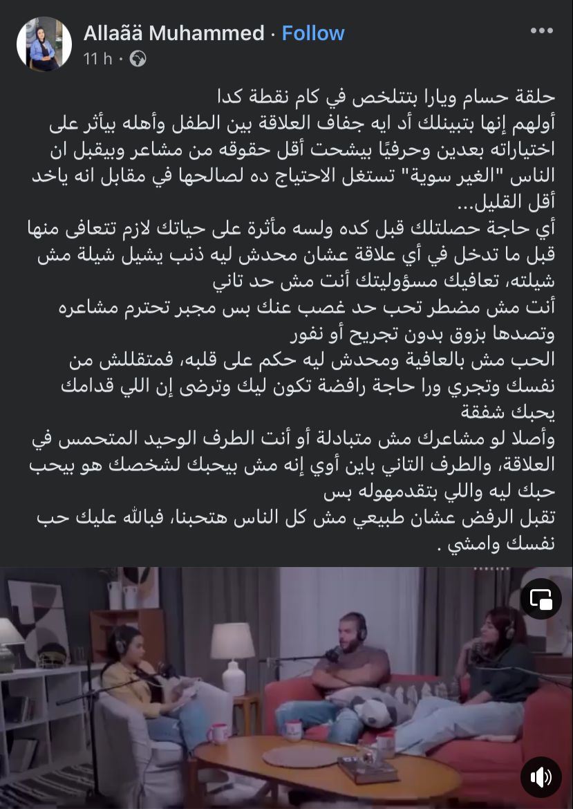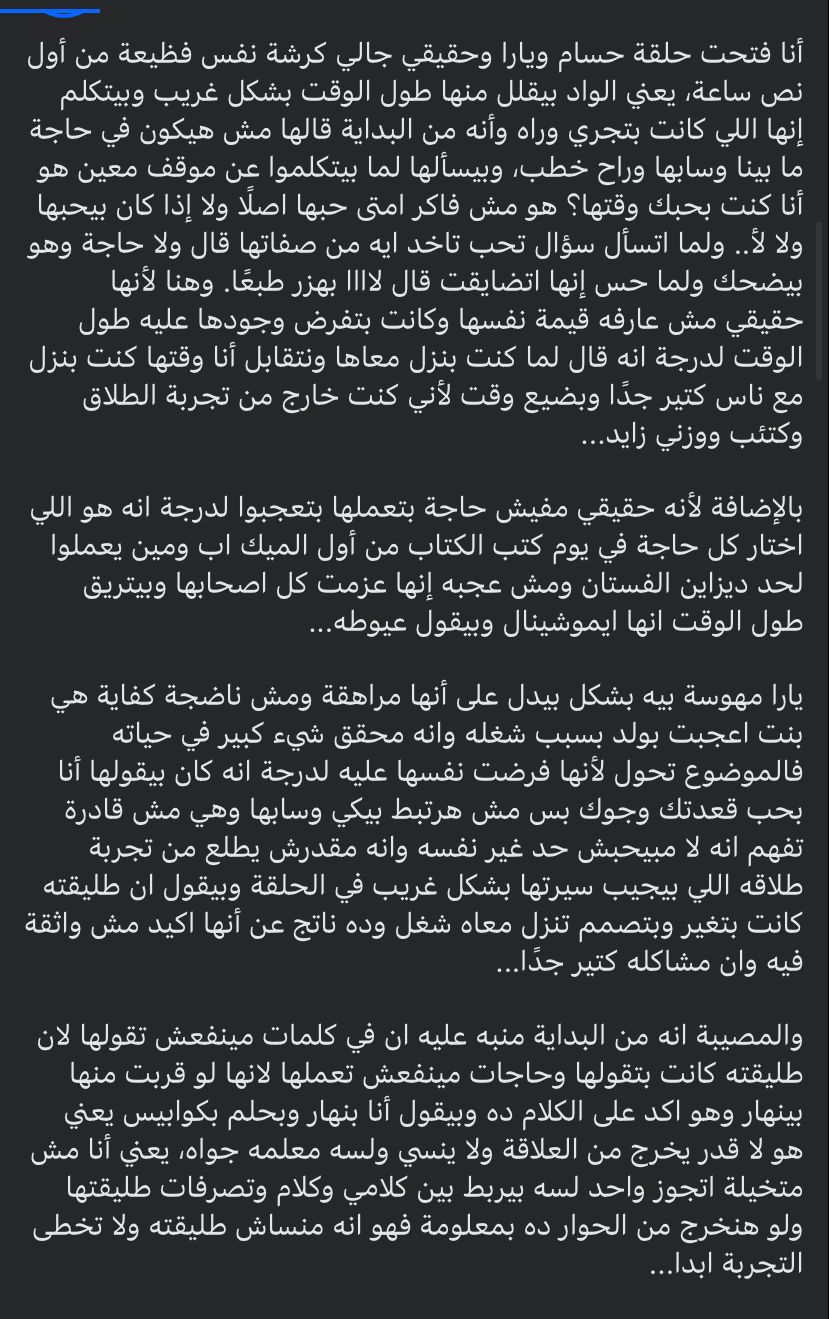 وكتبت صاحبة حساب عبر موقع فيسبوك: بعد حلقة حسام ويارا اللي لازم نبقى مقتنعين إن مينفعش تقدمي لأي حد تنازلات، حاسة إني مكسوفالها عامة، وحابة أقول أول ما الإنسان بيعرف قيمة نفسه، وإيه اللي يستحقه بيرفض أي علاقة، سواء عاطفية أو شغل أو صداقة مش بتديه اللي يستحقه، بيلاقي عقله بيديه إنذار إنه ما يهلكش نفسه في حاجة مش من قيمته، خليكى عارفة قيمتك علشان الناس ما بتصدق تلاقي شخص مهزوز تطلع فيه كل عقدها النفسية بجد.