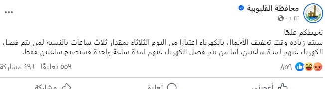 محافظة القليوبية تحذف منشورا عن زيادة مدة تخفيف أحمال الكهرباء لـ3 ساعات