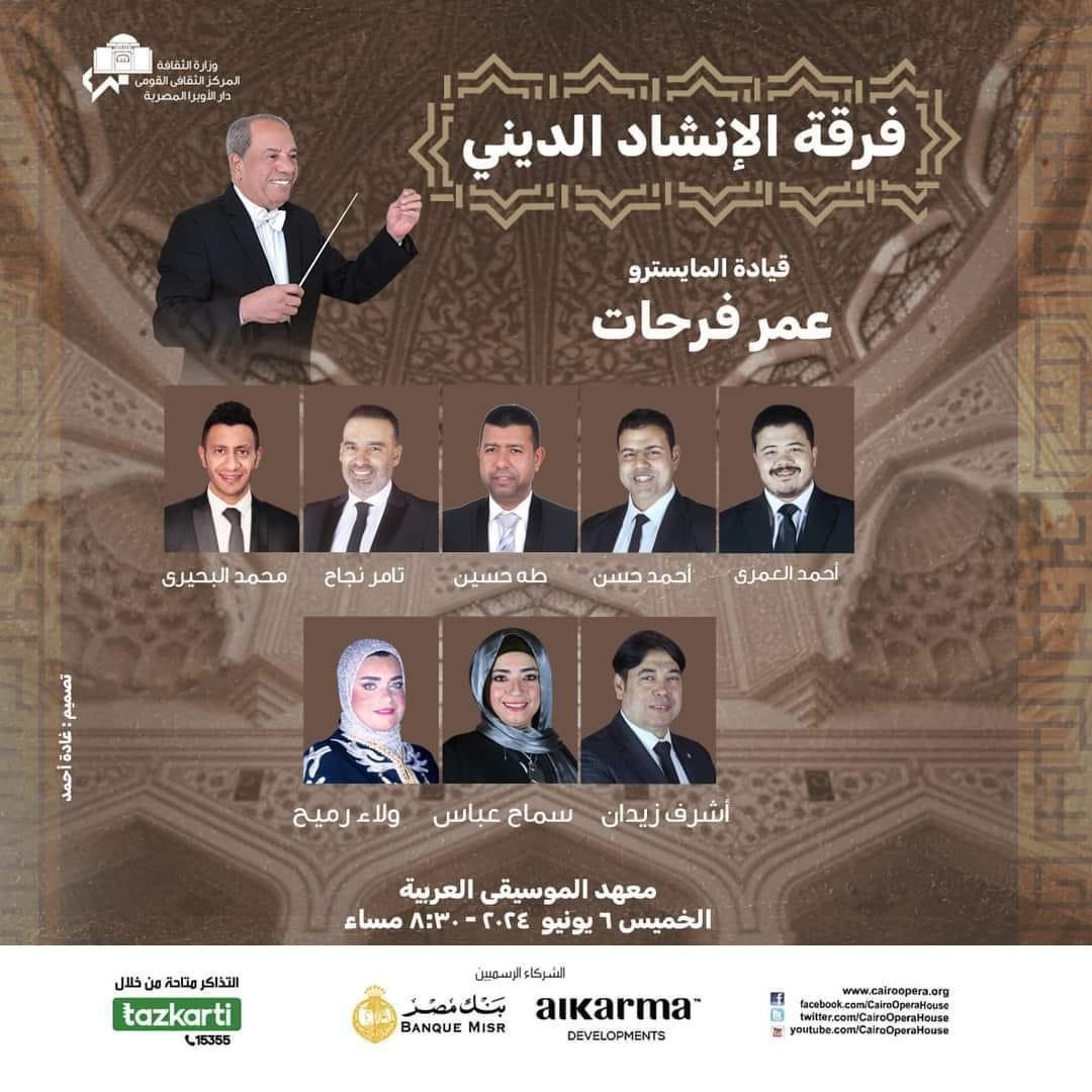 تنظم دار الأوبرا برئاسة الدكتورة لمياء زايد حفلًا لفرقة الإنشاد الديني بقيادة المايسترو عمر فرحات، في الثامنة والنصف مساء الخميس 6 يونيو، على مسرح معهد الموسيقى العربية، وذلك ضمن فعاليات الثقافة المصرية الهادفة لتقديم مختلف ألوان التراث.