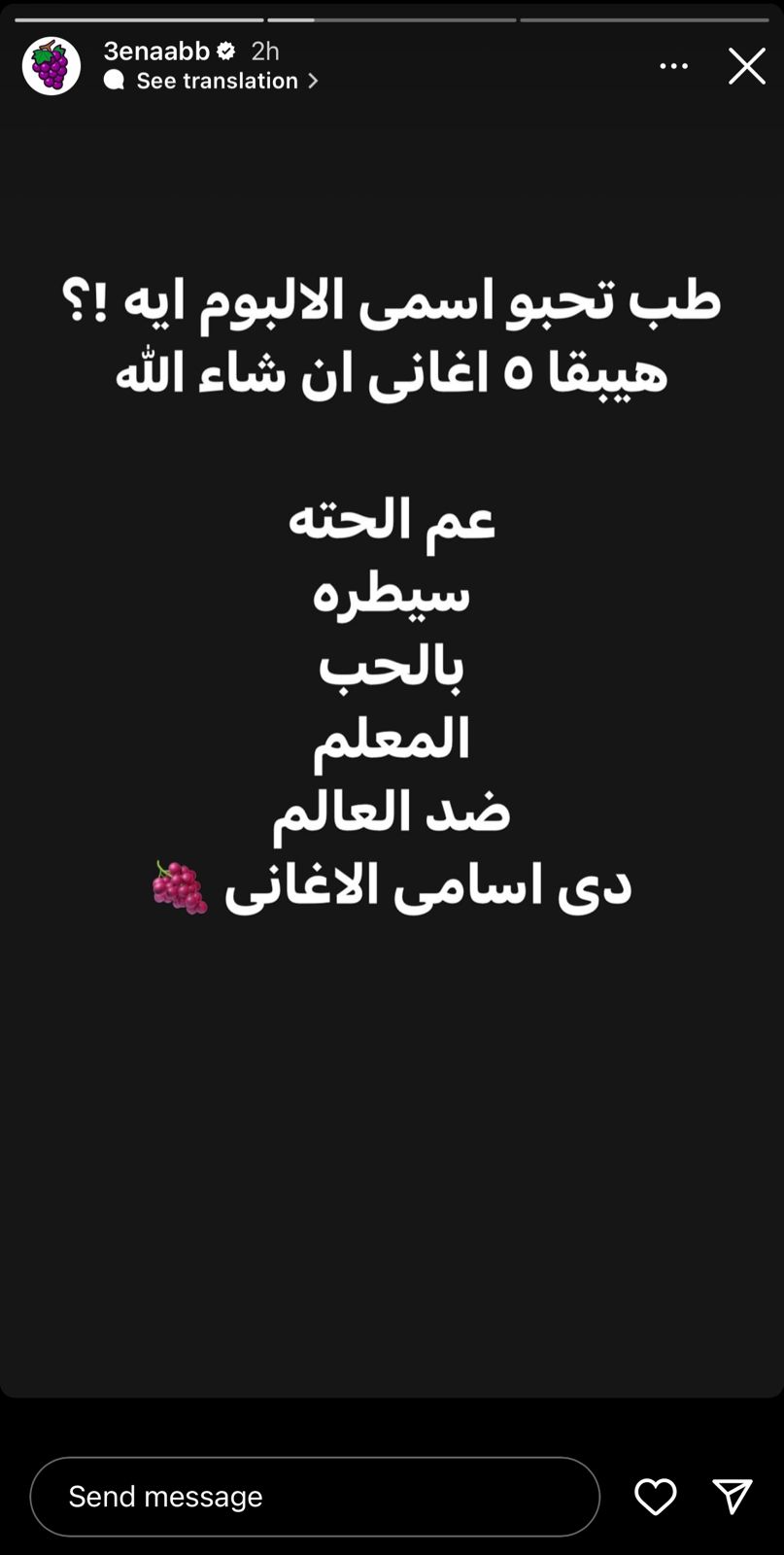 وكتب عنبة، منشورًا يكشف من خلاله أسماء أغاني الألبوم عبر خاصية ستورى على حسابه الشخصي بموقع انستجرام، وقال: طب تحبوا اسمى الألبوم إيه؟! هيبقى 5 أغاني إن شاء الله عم الحته، سیطرة، بالحب، المعلم، ضد العالم دی أسماء الأغاني وقفة العيد ميعادنا على اليوتيوب.