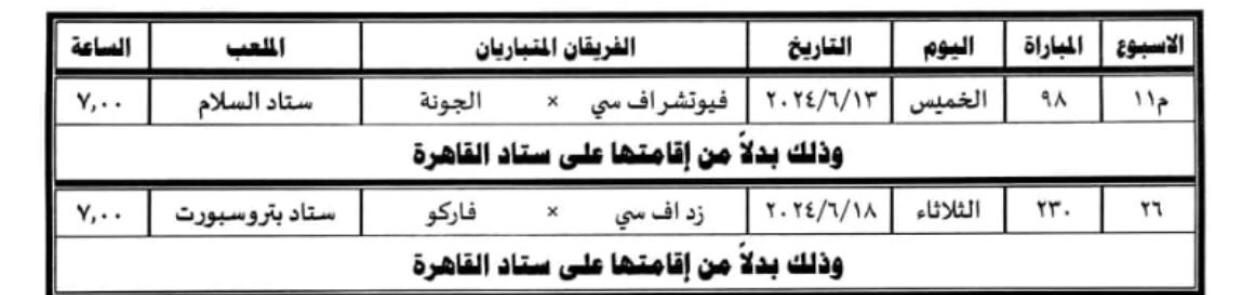 بالإضافة لـ تعديل ملعب مباراة زد اف سي وفاركو المقرر إقامتها يوم الثلاثاء الموافق 18 يونيو الجاري، في الجولة الـ 26، وإقامة المباراة على ستاد بتروسبورت في تمام الساعة السابعة مساءً بدلًا من إقامتها على ستاد القاهرة الدولي.