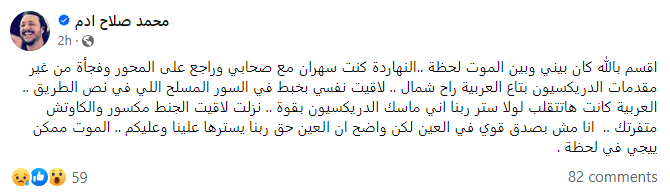 وكتب محمد صلاح آدم، عبر حسابه الشخصي بموقع فيسبوك: أقسم بالله كان بيني وبين الموت لحظة.. النهاردة كنت سهران مع صحابي وراجع على المحور وفجأة من غير مقدمات الدريكسيون بتاع العربية راح شمال.. لقيت نفسي بخبط في السور المسلح اللي في نص الطريق.