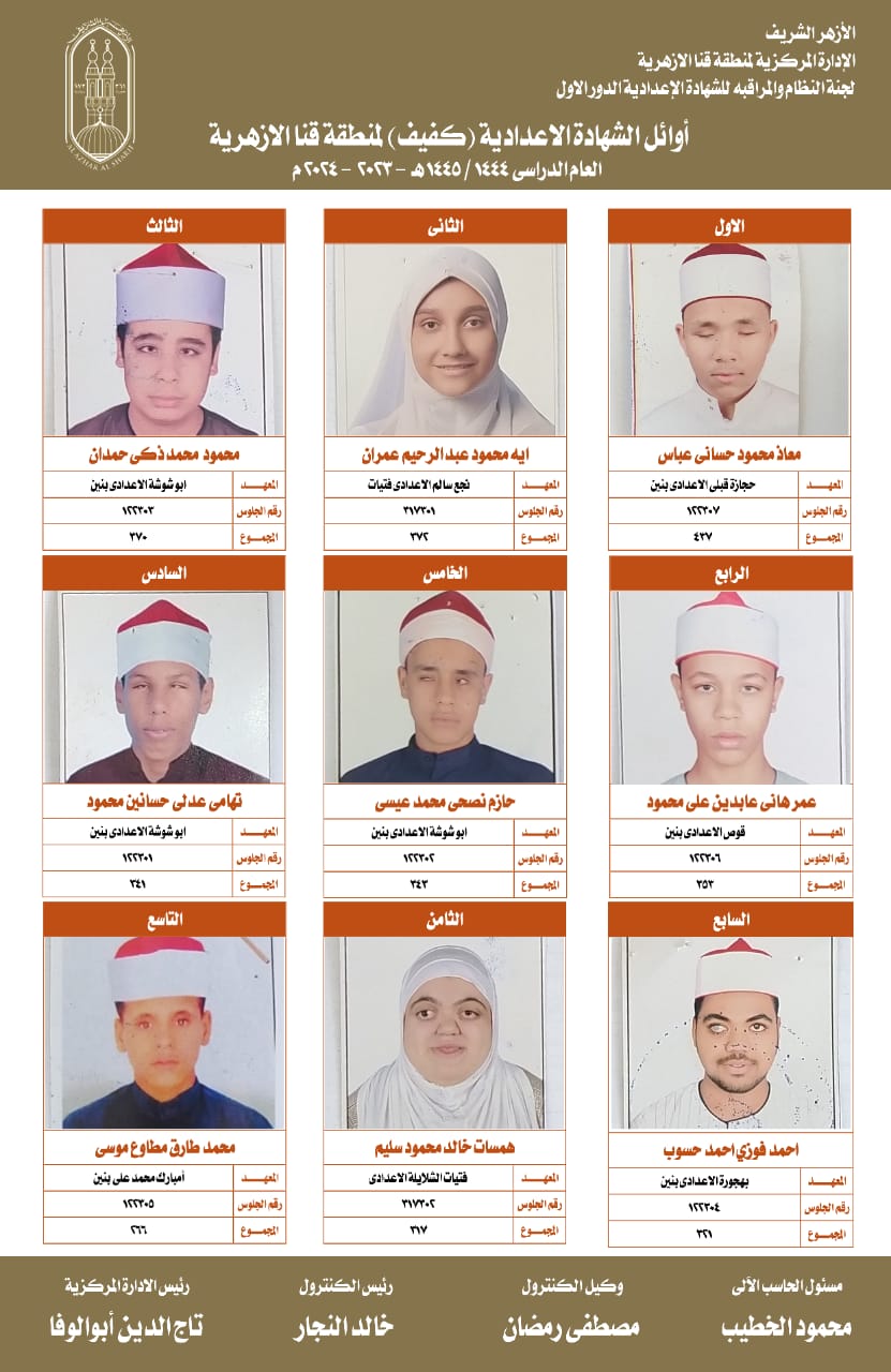 وجاء في المركز الثاني آية محمود حساني، بمجموع 372 بمعهد نجع سالم الإعدادي بنات، ثم محمود محمد علي حمدان، بمجموع 370 بمعهد أبوشوشة الإعدادي بنين، وعمر هاني عابدين علي، بمجموع 353 بمعهد قوص الإعدادي بنين، وحازم نصحي محمد، بمجموع 343 بمعهد أبوشوشة الإعدادي بنين، وتهامي عدلي حسنين، بمجموع 341 بمعهد أبوشوشة الإعدادي بنين، وأحمد فوزي أحمد حسب، بمجموع 321 بهجورة الإعدادي بنين، وهمسات خالد محمود، بمجموع 317 بمدرسة الشلايلة الإعدادي، ومحمد طارق مطاوع موسى، بمجموع 266 مدرسة امبارك محمد علي بنين