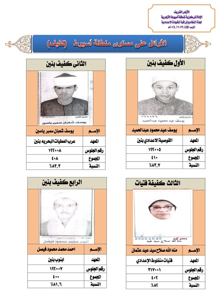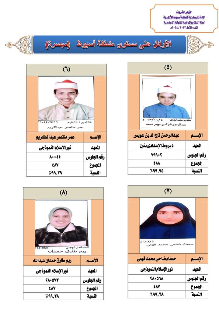 أسماء أوائل الشهادة الإعدادية الأزهرية بأسيوط
