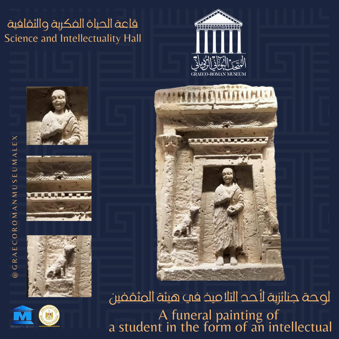 أعلنت إدارة المتحف اليوناني الروماني بالإسكندرية، عن عرض لوحة جنائزية حيث يقف تلميذ مدرسي صغير في هيئة المثقفين داخل واجهة معمارية مصرية، ويحمل في يده اليسرى عنقود من العنب ربما يكون رمز لديونيسوس أو بالأحرى أوزيريس، وتعكس هذه اللوحة الجنائزية الخلفيات الثقافية والدينية لجانب من الصفوة السكندرية.