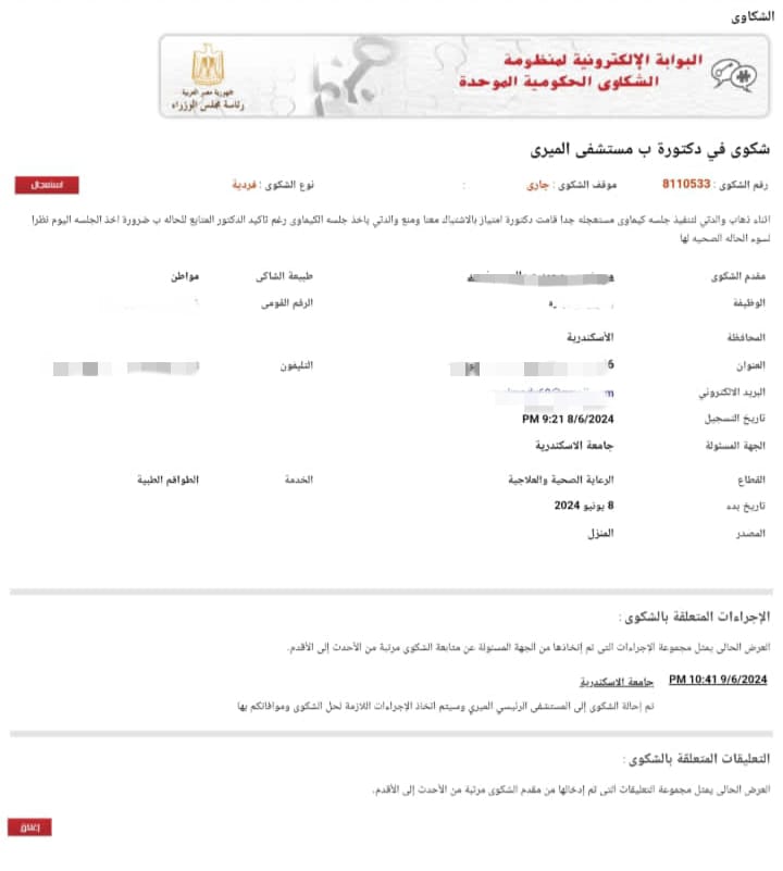 أرسلت ابنة مريضة تُدعى هدى السيد، شكوى عبر البوابة الإلكترونية لمنظومة الشكاوى الحكومية، تضمنت استغاثتها من تعنت طبيبة امتياز في قسم الأورام بالمستشفى الرئيسي الجامعي في الإسكندرية مع والدتها، ومنعها من تلقي جرعة العلاج.