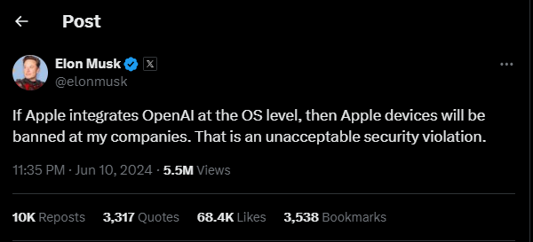 ولم يقدم الملياردير الأمريكي، إيلون ماسك، أي تفاصيل إضافية بشأن الحظر المحتمل أو الظروف التي أدت إلى هذا الموقف الحازم، ودمج OpenAI في نظام التشغيل الخاص بشركة Apple، كما ذكر ماسك، سيمثل خطوة مهمة من جانب Apple لتعزيز أجهزتها بقدرات الذكاء الاصطناعي.
