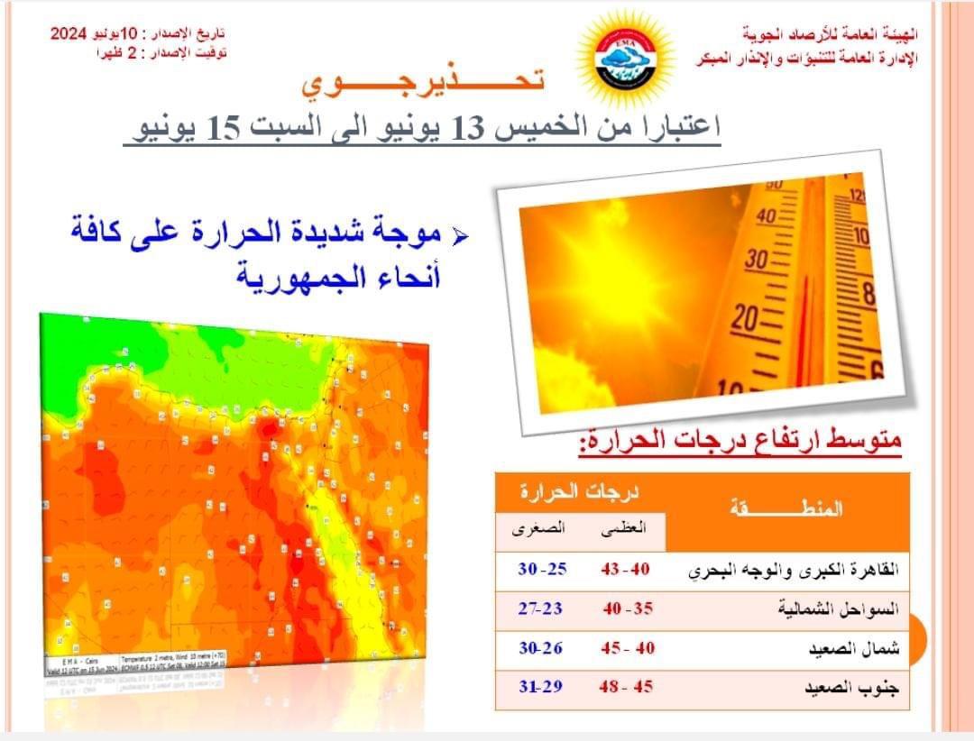 وتابعت الأرصاد الجوية: تبلغ ذروة هذه الحالة يوم الخميس 13 يونيو وحتى يوم السبت 15 يونيو لتتخطى العظمى على القاهرة 40 درجة مئوية.