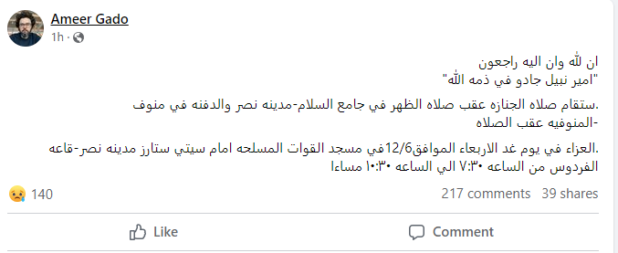 وكشف أسرة المؤلف الموسيقي الراحل أمير جادو موعد العزاء حيث سيقام يوم غد الأربعاء الموافق 12 يونيو في مسجد القوات المسلحة بمدينة نصر، قاعة الفردوس من الساعة 7 ونص إلى الساعة 10 ونص مساء.