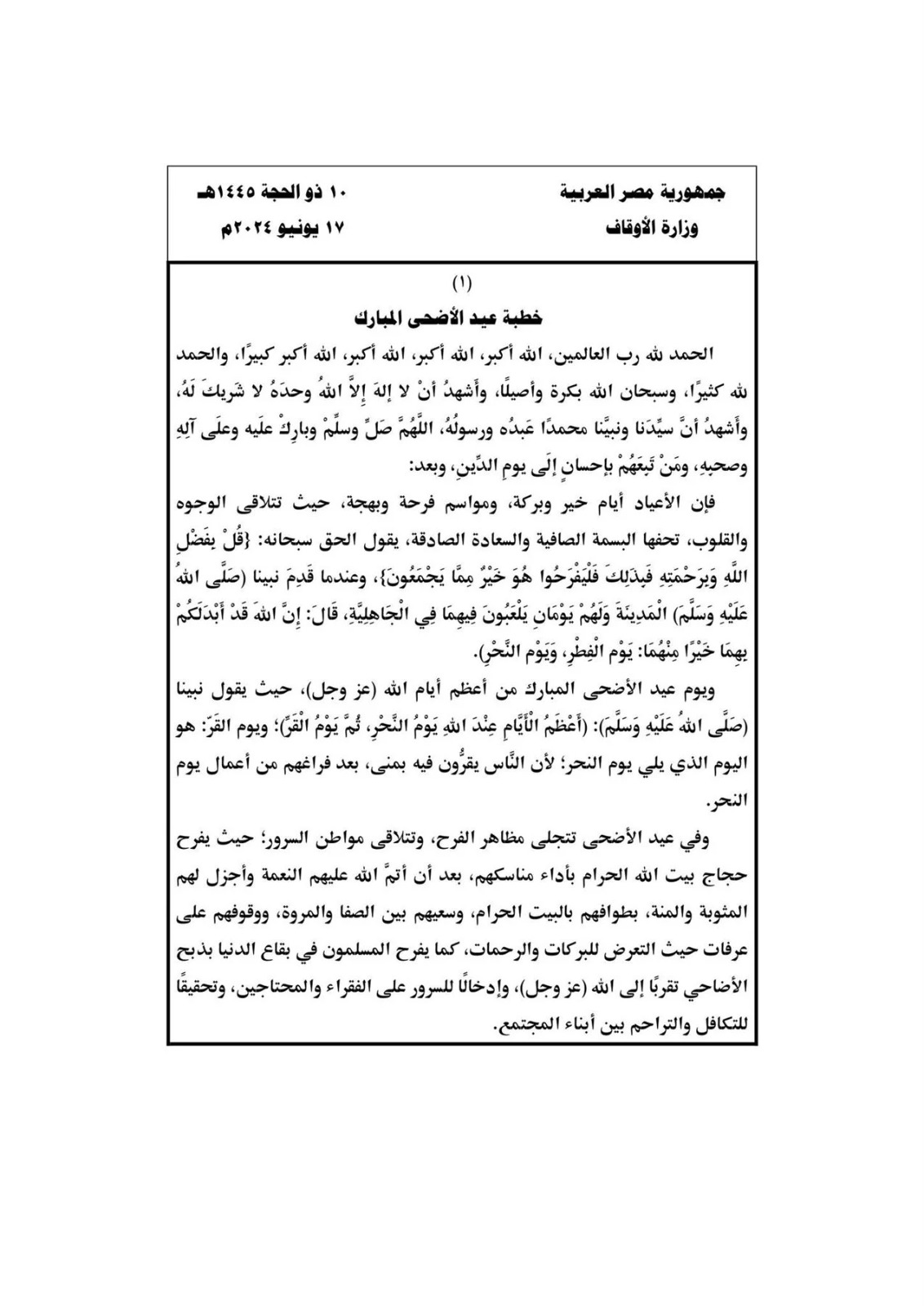 حددت وزارة الأوقاف المصرية، نص خطبة عيد الأضحى المبارك 1445 هــ، والمقرر له أن يكون الأحد المقبل الموافق 16 يونيو 2024، وجاء نص خطبة عيد الأضحى المبارك كالتالي: