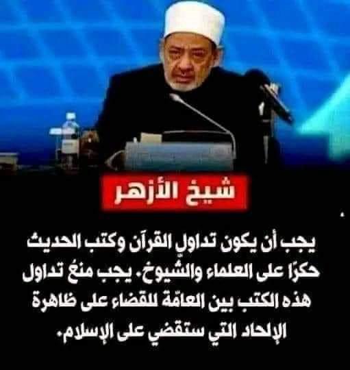 تداول مستخدمو مواقع التواصل الاجتماعي، خلال الساعات الماضية، تصريحا منسوبا للإمام الأكبر الدكتور أحمد الطيب شيخ الأزهر الشريف، يقول فيه إنه يجب أن يكون تداول القرآن وكتب الحديث حكرا على العلماء والشيوخ ويجب منع تداول هذه الكتب بين العامة للقضاء على ظاهرة الإلحاد التي ستقضي على الإسلام، ما أثار تساؤلات حول حقيقة هذا الكلام.