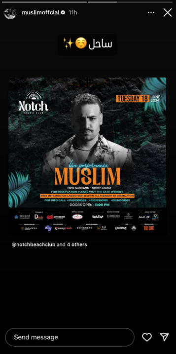 ونشر مسلم، بوستر حفله وعلق قائلًا: ساحل، ومن المقرر أن تقام حفله يوم الثلاثاء الموافق 18 يونيو بالساحل الشمالي.
