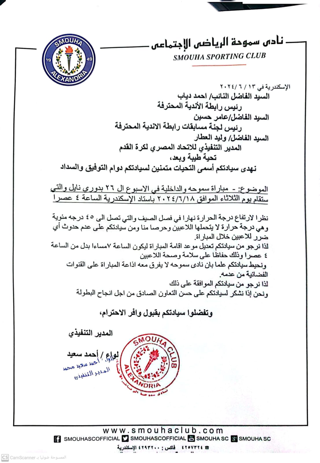 "نظرا لارتفاع درجة الحرارة نهارا في فصل الصيف والتي تصل إلى 45 درجه مئوية وهي درجة حرارة لا يتحملها اللاعبين وحرصا منا ومن سيادتكم على عدم حدوث أي ضرر للاعبين خلال المباراة، لذا نرجو من سيادتكم تعديل موعد إقامة المباراة ليكون الساعة 7 مساء بدلا من الساعة 4 عصرا وذلك حفاظا على سلامة وصحة اللاعبين، ونحيط سيادتكم علما بأن نادي سموحة لا يفرق معه إذاعة المباراة على القنوات الفضائية من عدمه.