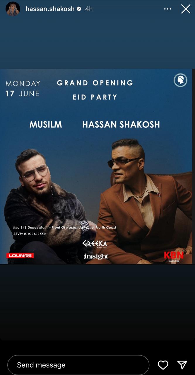 وروج المطرب حسن شاكوش للحفل الذي يجمعه مع مسلم يوم 17 يونيو، عبر حسابه الشخصي بموقع انستجرام، دون كشف تفاصيل أخرى.