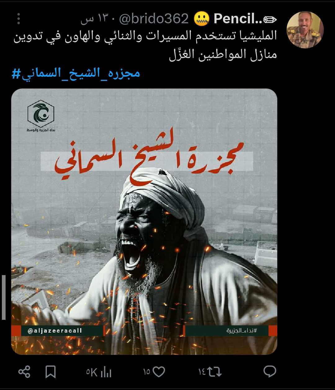 خلال الساعات الماضية، تصدر وسم مجزرة الشيخ السماني، وذلك بعد أن ارتكبت قوات الدعم السريع مجزرة دامية في حق الشعب السوداني.