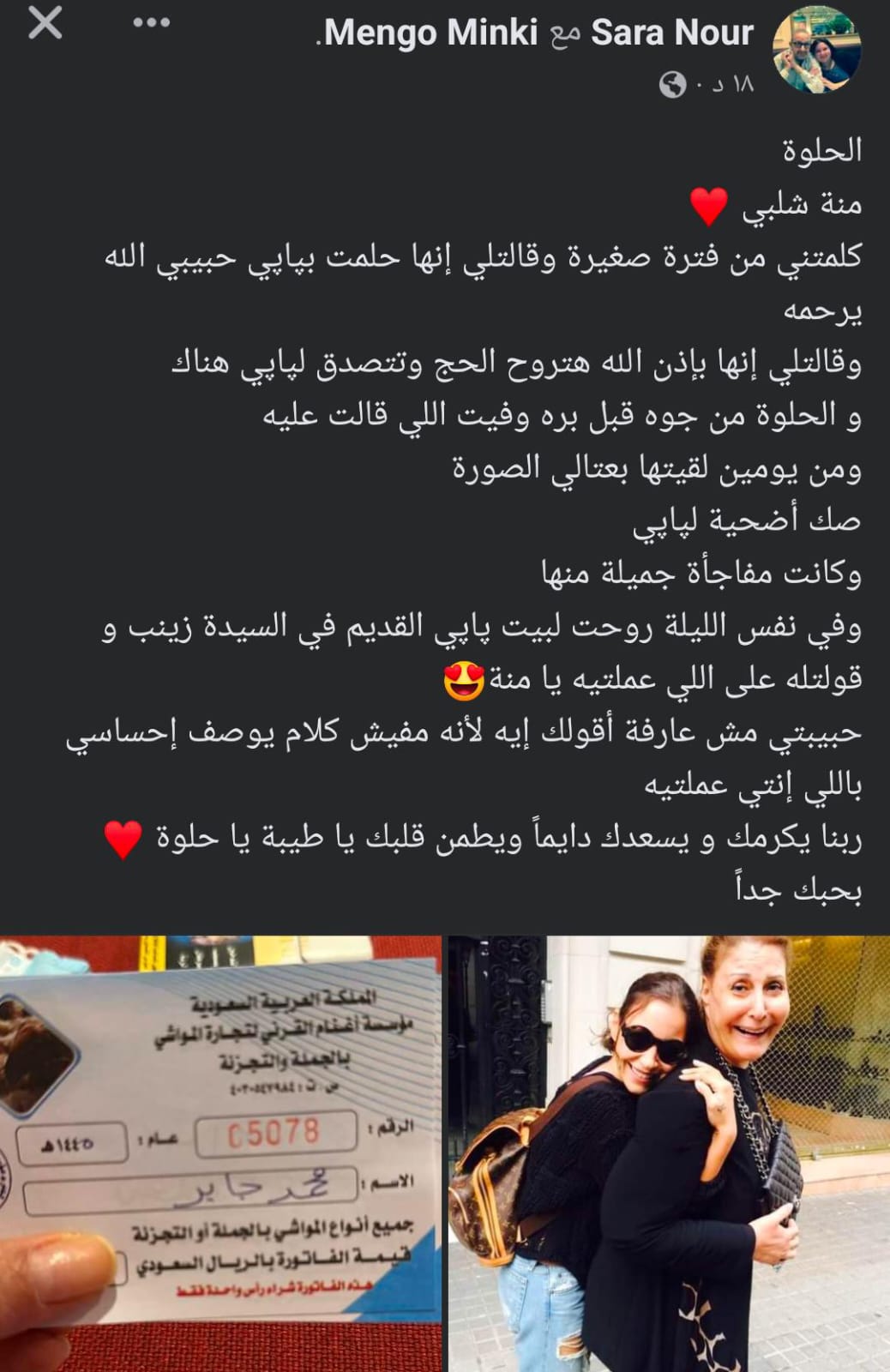 وكتبت سارة نور الشريف منشورًا عبر حسابها الشخصي بموقع فيسبوك، جاء فيه: الحلوة منة شلبي، كلمتني من فترة صغيرة وقالتلي إنها حلمت بـ بابي حبيبي الله يرحمه، وقالتلي إنها بإذن الله هتروح الحج، وتتصدق لبابي هناك.
