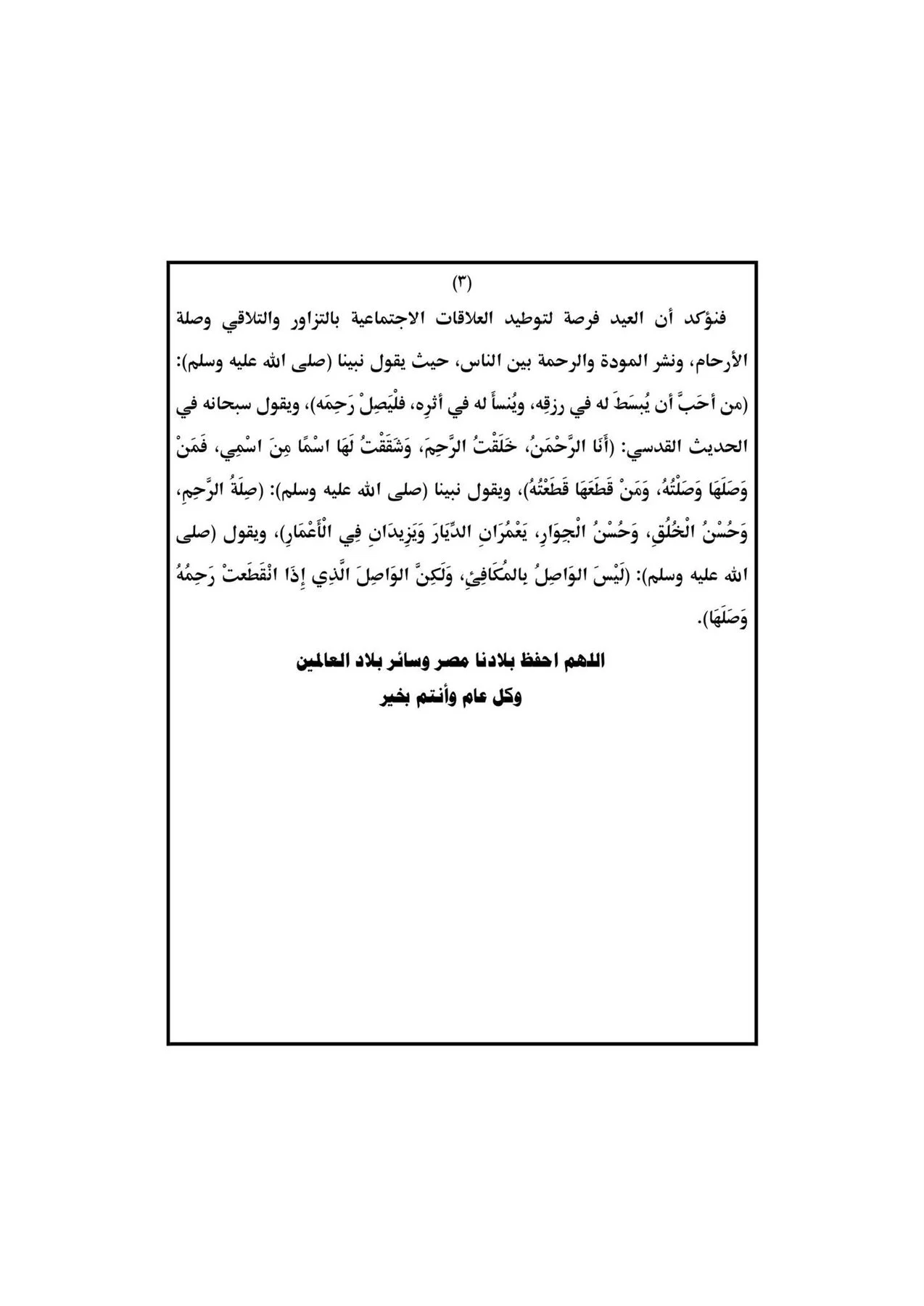 فاشكروا الله في السراء والضراء وقوموا أنفسكم إن اعوجت، واهنئوا بعيدكم بعفو وإحسان تقبل الله منا ومنكم وضاعف لنا ولكم الجزاء واسألوا الله العفو والعافية والمغفرة إنه ولي ذلك والقادر عليه..