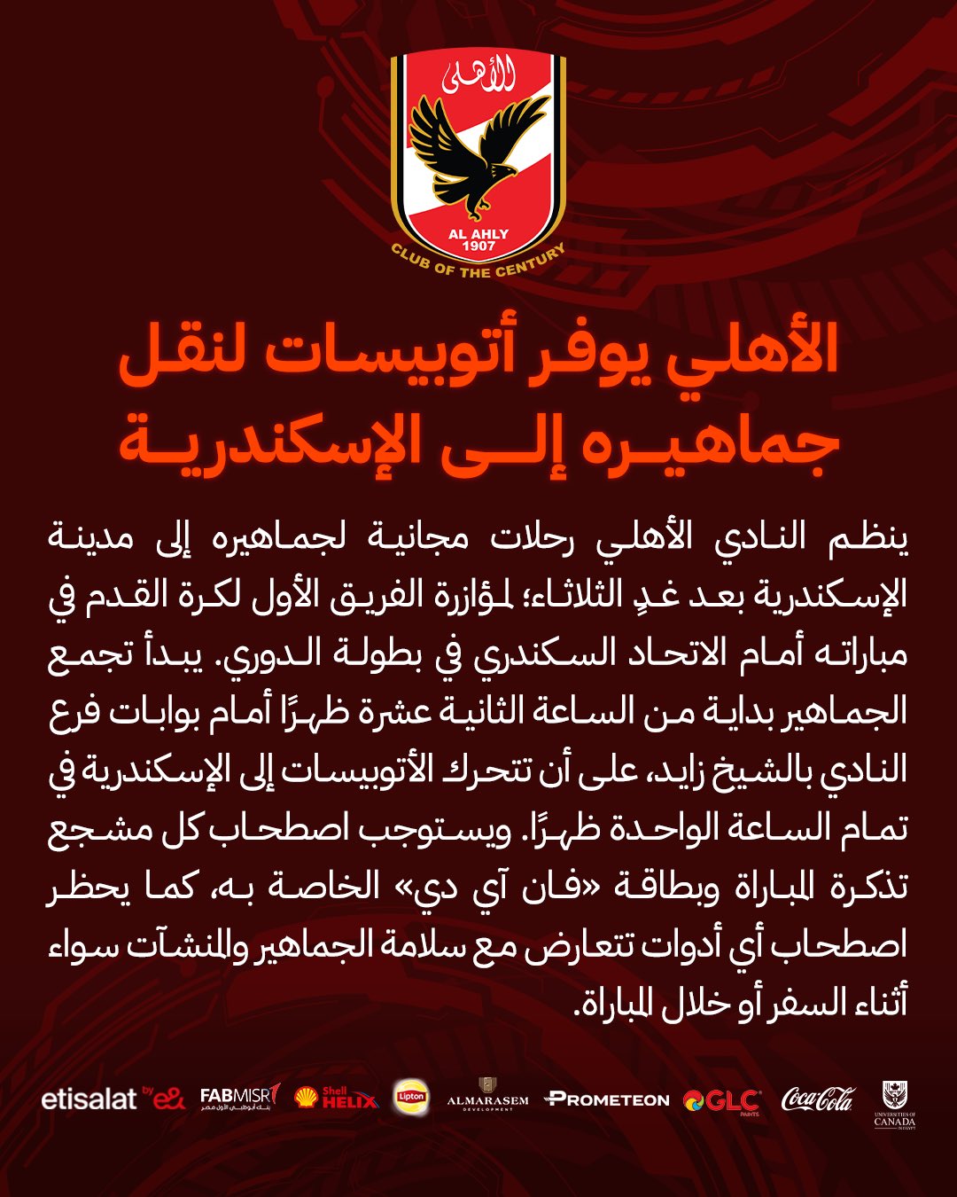 ونشر النادي الأهلي بيان رسمي عبر منصاته على مواقع التواصل الاجتماعي جاء فيه: ينظم النادي الأهلي رحلات مجانية لجماهيره إلى مدينة الإسكندرية بعد غد الثلاثاء المؤازرة الفريق الأول لكرة القدم في مباراته أمام الاتحاد السكندري في بطولة الدوري.