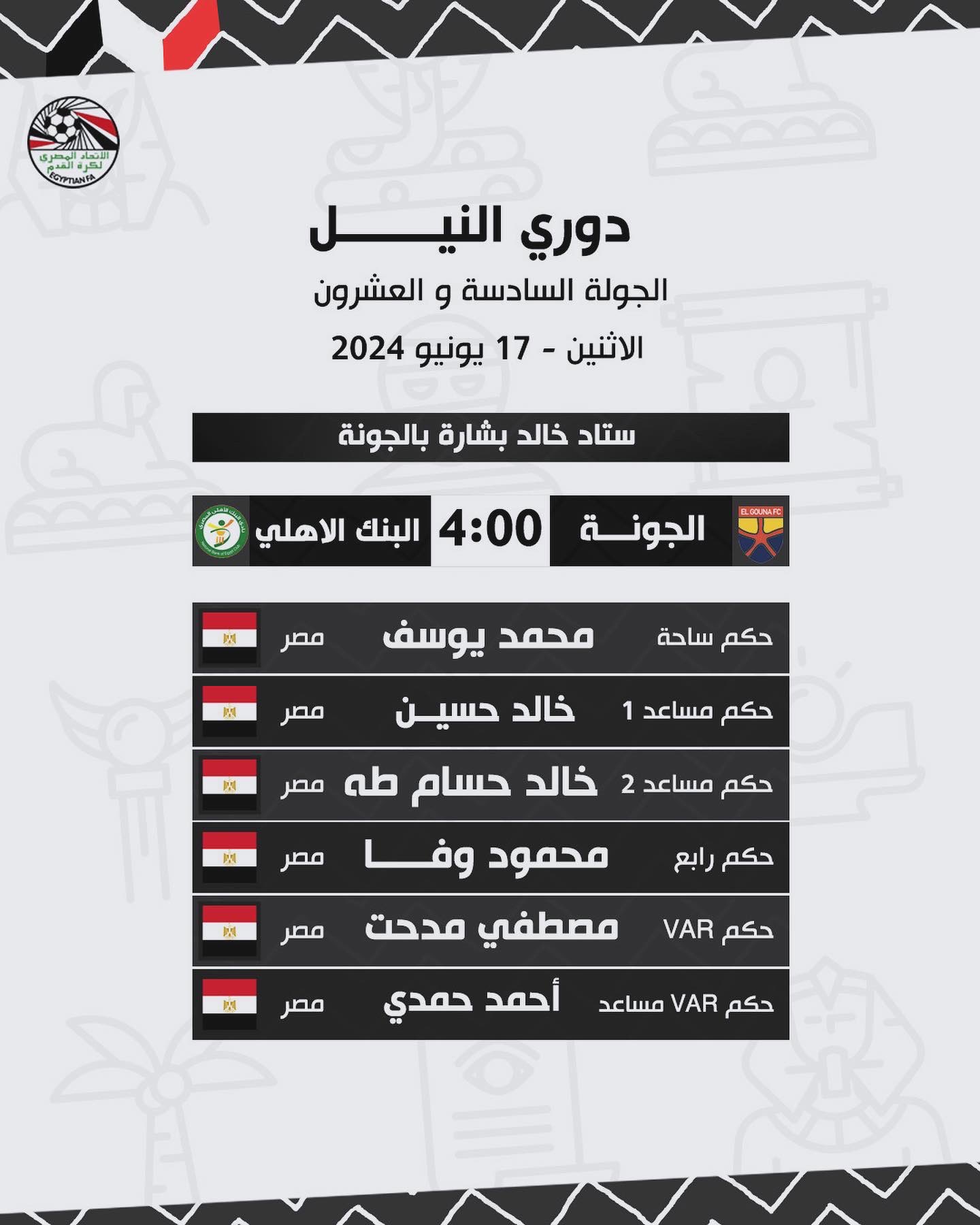 طاقم حكام مباراة الجونة والبنك الأهلي
