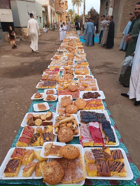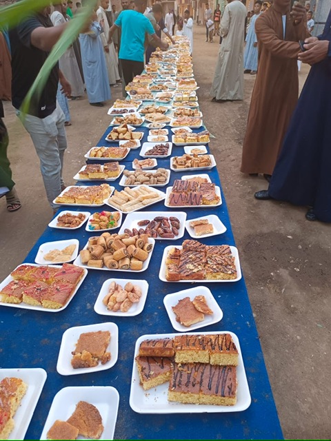 وأضاف مصطفى: جهز جميع شباب القرية من ليلة العيد، وبدأنا فرش الموائد بطول شوارع القرية وعليها أطباق الحلويات المختلفة مع بداية صلاة العيد.