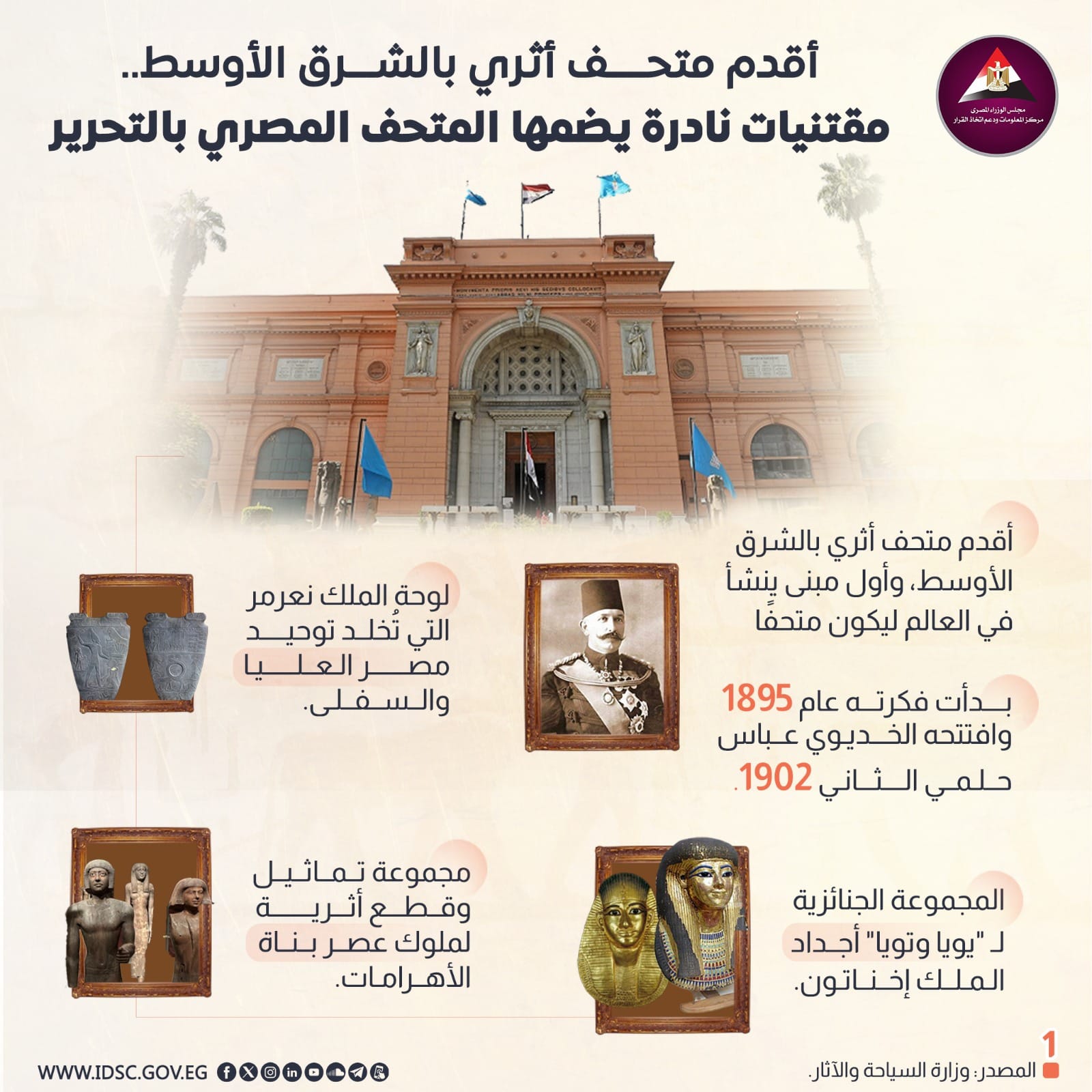 أكد مركز المعلومات ودعم اتخاذ القرار بمجلس الوزراء، أن المتحف المصري بالتحرير أحد المعالم التاريخية والسياحية بالقاهرة، فهو أقدم متحف أثري في الشرق الأوسط، وأول مبنى ينشأ في العالم ليكون متحفًا.