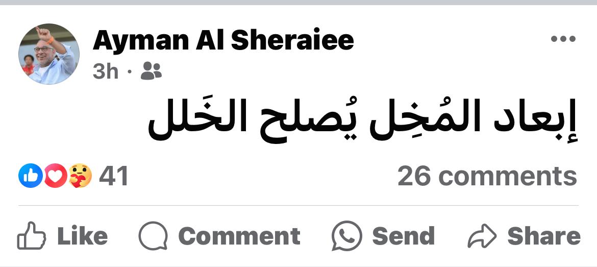 وكان الشريعي قد كتب عبر صفحته على موقع التواصل الاجتماعي فيسبوك: إبعاد المخل يصلح الخلل، وذلك تعليقا على الأحداث الجارية.