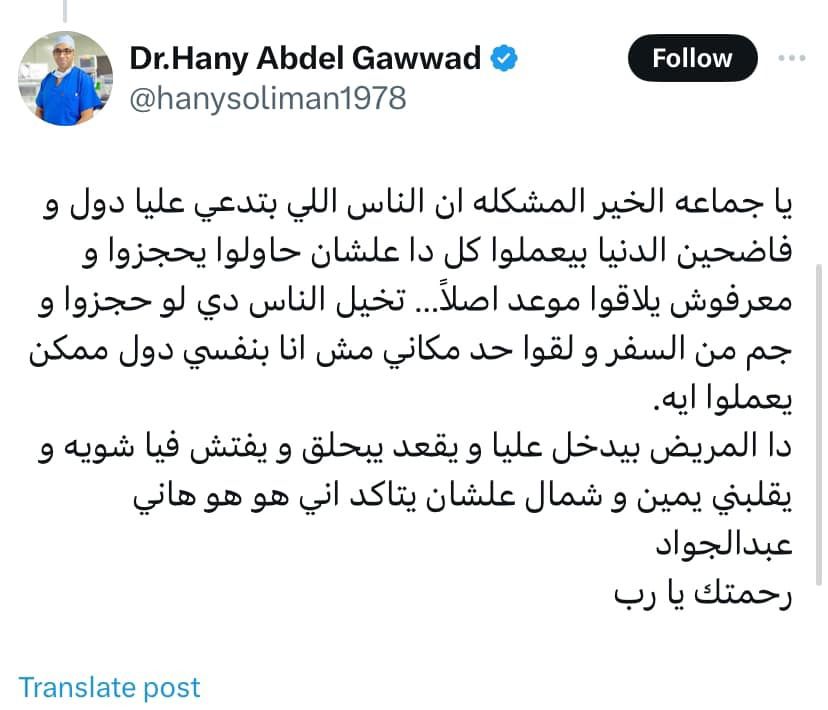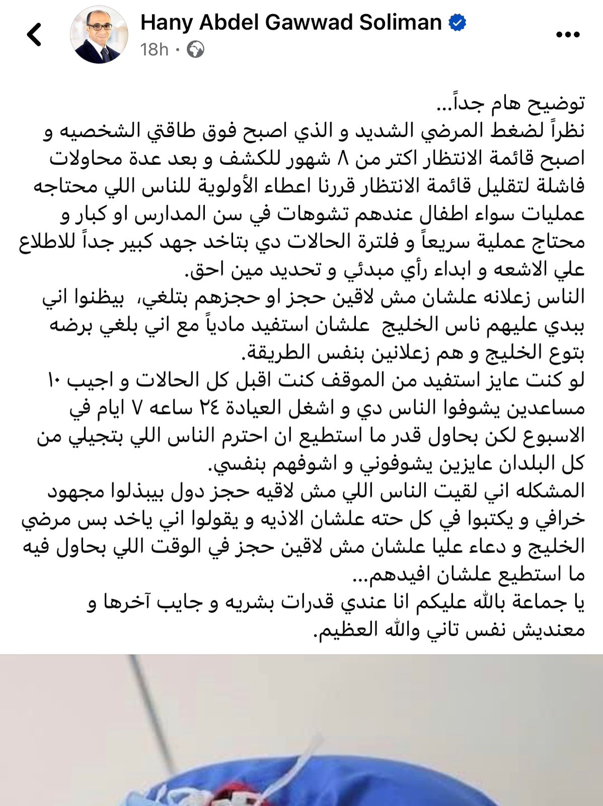 وأوضح خلال منشوره: المشكلة إني لقيت الناس اللي مش لاقية حجز دول بـ يبذلوا مجهود خرافي وبـ يكتبوا في كل حتة عشان الأذية ويقولوا إني باخد بس مرضى الخليج، ودعاء عليا عشان مش لاقين حجز في الوقت اللي بحاول فيه أعمل ما أستطيع علشان أفيدهم، مختتمًا: يا جماعة بالله عليكم أنا عندي قدرات بشرية وجايب آخرها ومعنديش نفس تاني والله العظيم.