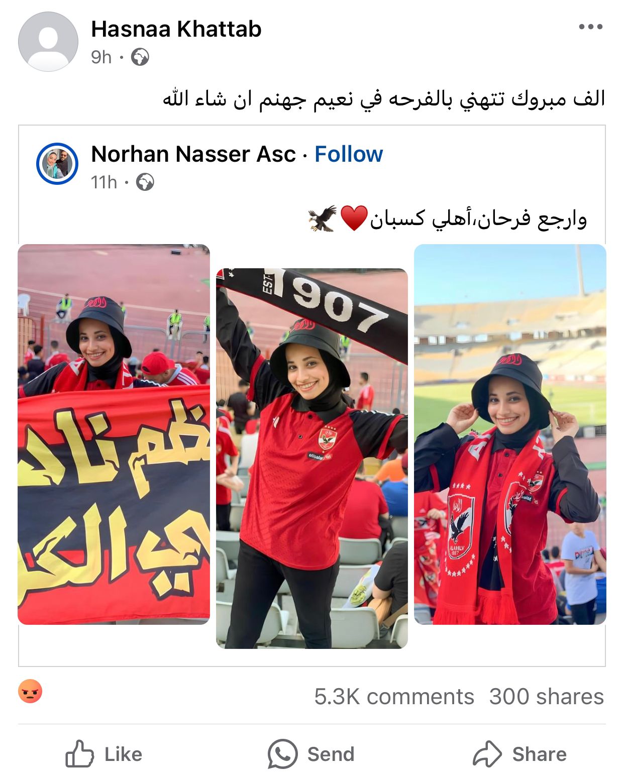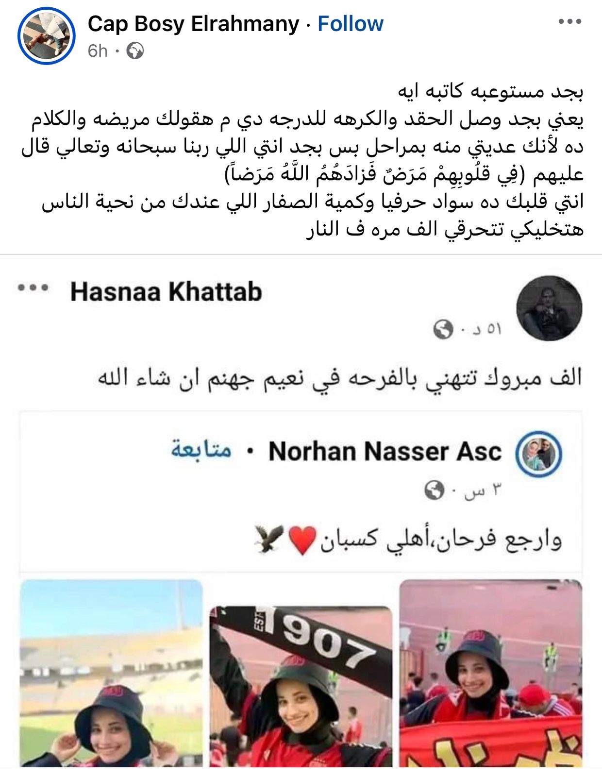 وشاركت فتاة من حساب بـ اسم حسناء خطاب، بأحد المنشورات على منصة التواصل الاجتماعي فيسبوك، معلقة على وفاة نورهان ناصر مشجعة الأهلي: ألف مبروك تتهني بالفرحة في نعيم جهنم إن شاء الله.