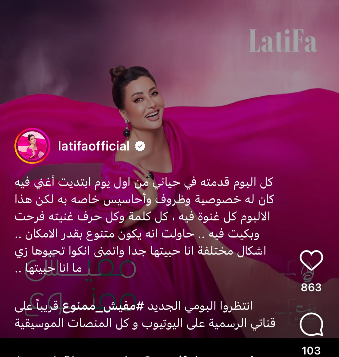 وأضافت لطيفة: انتظروا ألبومي الجديد قريبًا على قناتي الرسمية على اليوتيوب وكل المنصات الموسيقية.