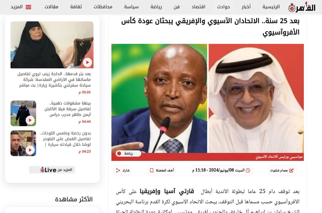 وانفرد القاهرة 24، في يوم 8 يونيو الماضي بنشر تفاصيل المحادثات التي جمعت باتريس موتسيبي رئيس كاف، مع الشيخ سليمان بن إبراهيم رئيس الاتحاد الآسيوي لكرة القدم على هامش اجتماعات كونجرس الاتحاد الدولي لكرة القدم، فيفا، بشأن عودة البطولة الأفروآسيوية.