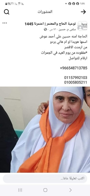 وكتب أهل الحاجة آمنة حسين على إحدى صفحات موقع التواصل الاجتماعي فيس بوك المعنية بالبحث عن الحجاج المفقودين في وقت سابق منشورا باسمها وصورتها، باحثين عنها بعد فقد الاتصال معها بعد رمي الجمرات في أول أيام عيد الأضحى.