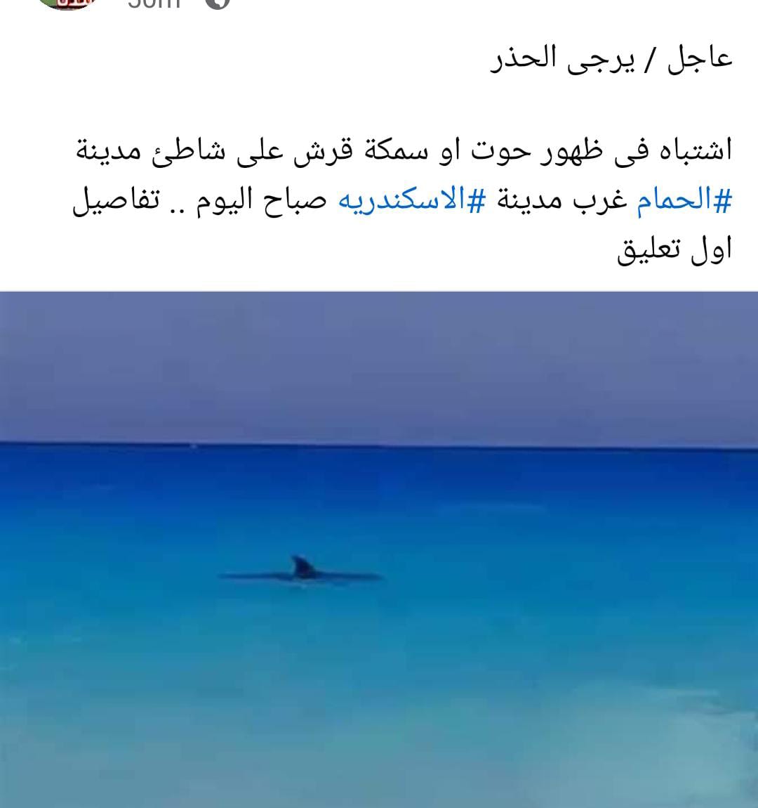 تداول رواد شاطئ الحمام، غرب محافظة الإسكندرية، منشورات بالصور على مواقع التواصل الاجتماعي، عن الاشتباه في ظهور حوت أو سمكة قرش على الشاطئ، منوهين بضرورة الحذر منه.