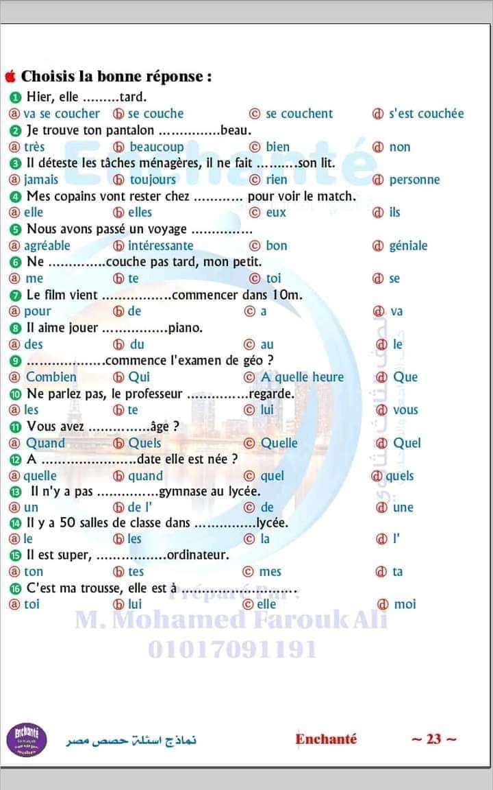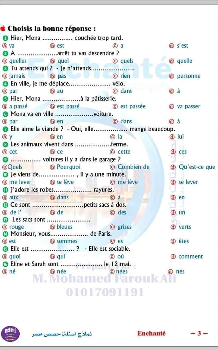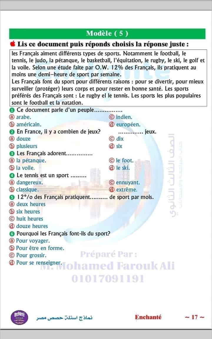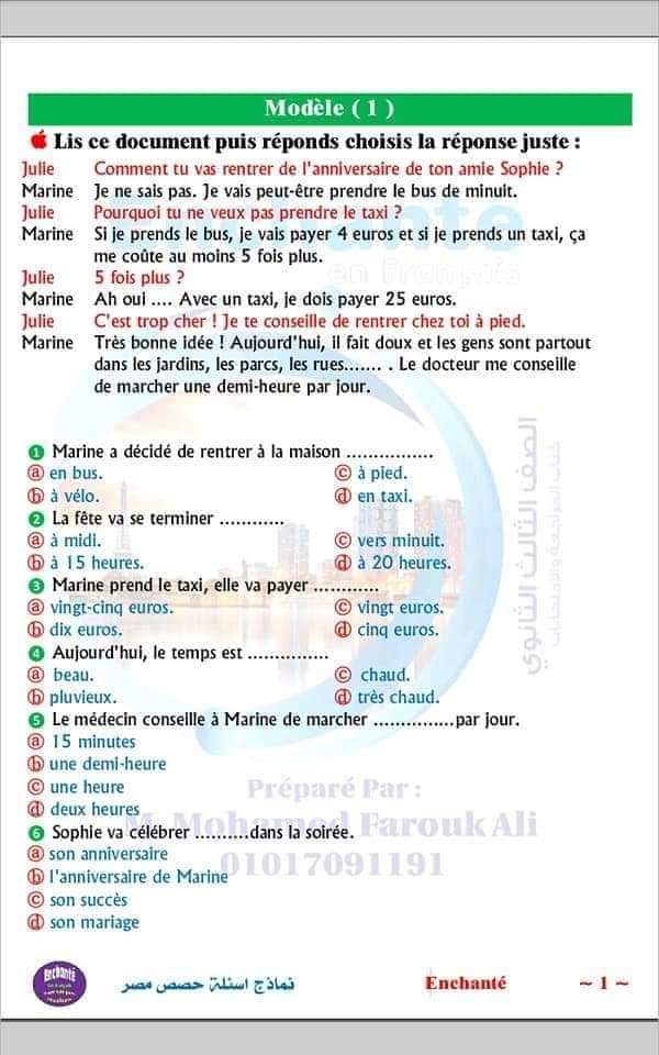 نماذج المراجعة النهائية أسئلة اللغة الفرنسية لطلاب الثانوية العامة 2024