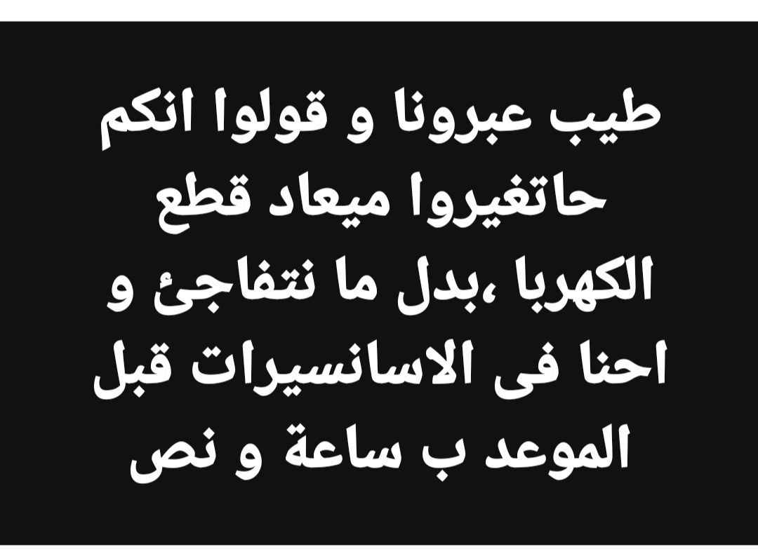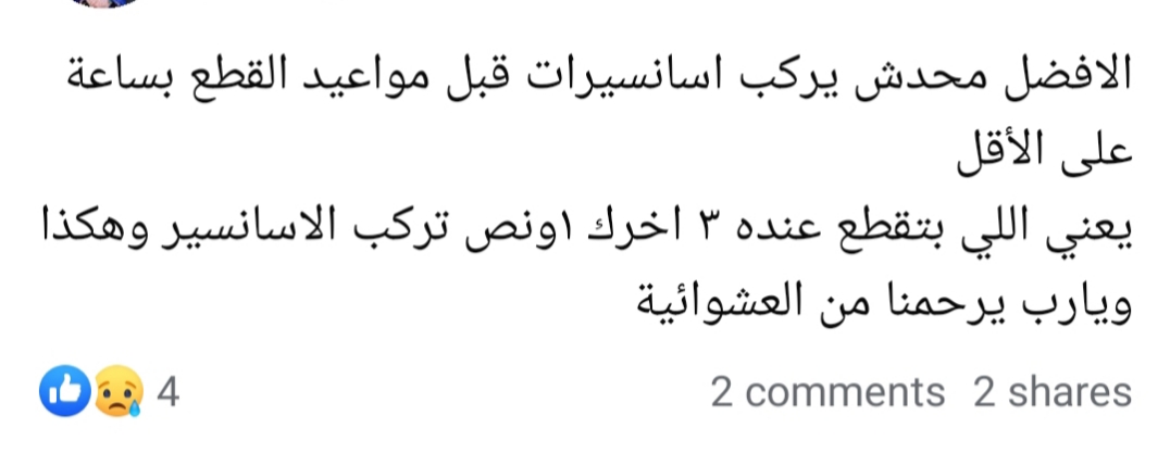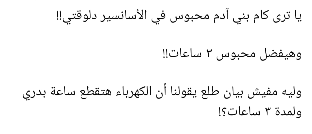 طيب قولوا إنكم هتغيروا ميعاد انقطاع الكهرباء بدل ما نتفاجئ واحنا في الأسانسير قبلها بساعة ونصف.. بهذه الكلمات علقت إحدى المواطنات عن عدم إعلان الشركة عن تغيير مواعيد الانقطاع وزيادها من قبل التنفيذ، فيما قال آخر إن الحل الأفضل لتفادي الأزمات عدم استقلال المصاعد قبل موعد الانقطاع بساعة على الأقل.