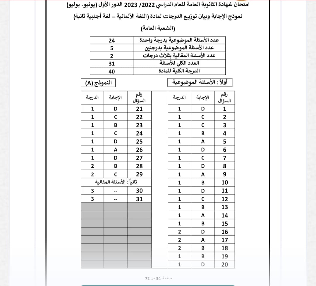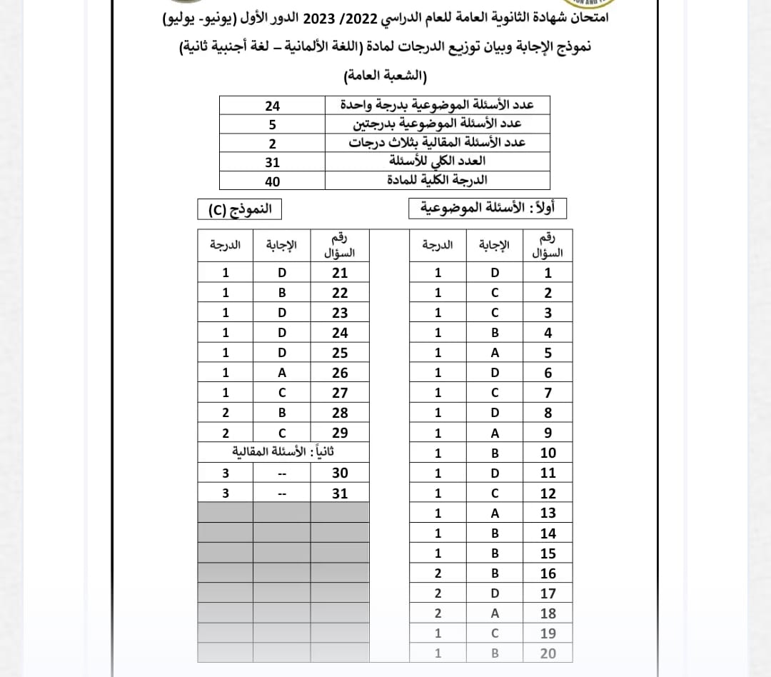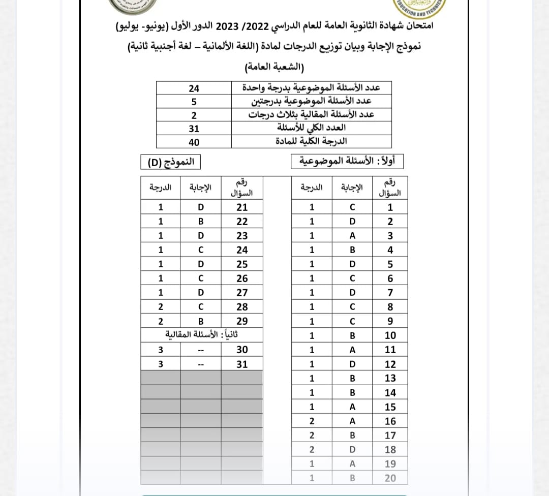 وقد قدمت وزارة التربية والتعليم إجابات امتحان اللغة الألمانية ثانوية عامة 2023 النموذجية كما في الصور الآتية.