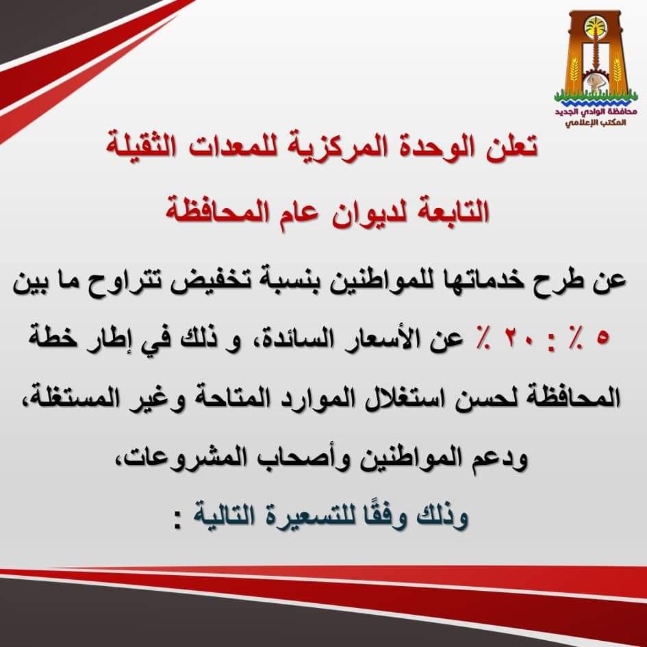 أعلنت الوحدة المركزية للمعدات الثقيلة التابعة لديوان عام محافظة الوادي الجديد، في بيان رسمي لها اليوم الاثنين، عن طرح خدماتها للمواطنين بنسبة تخفيض تتراوح ما بين 5 % و20 % عن الأسعار السائدة.